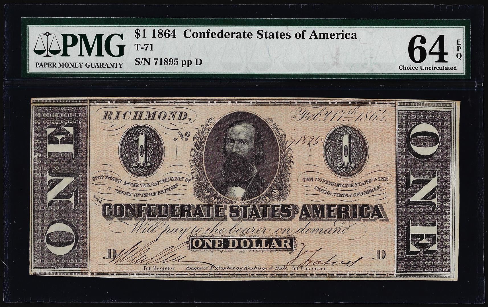 1864 $1 Confederate States of America Note T-71 PMG Choice Uncirculated 64EPQ