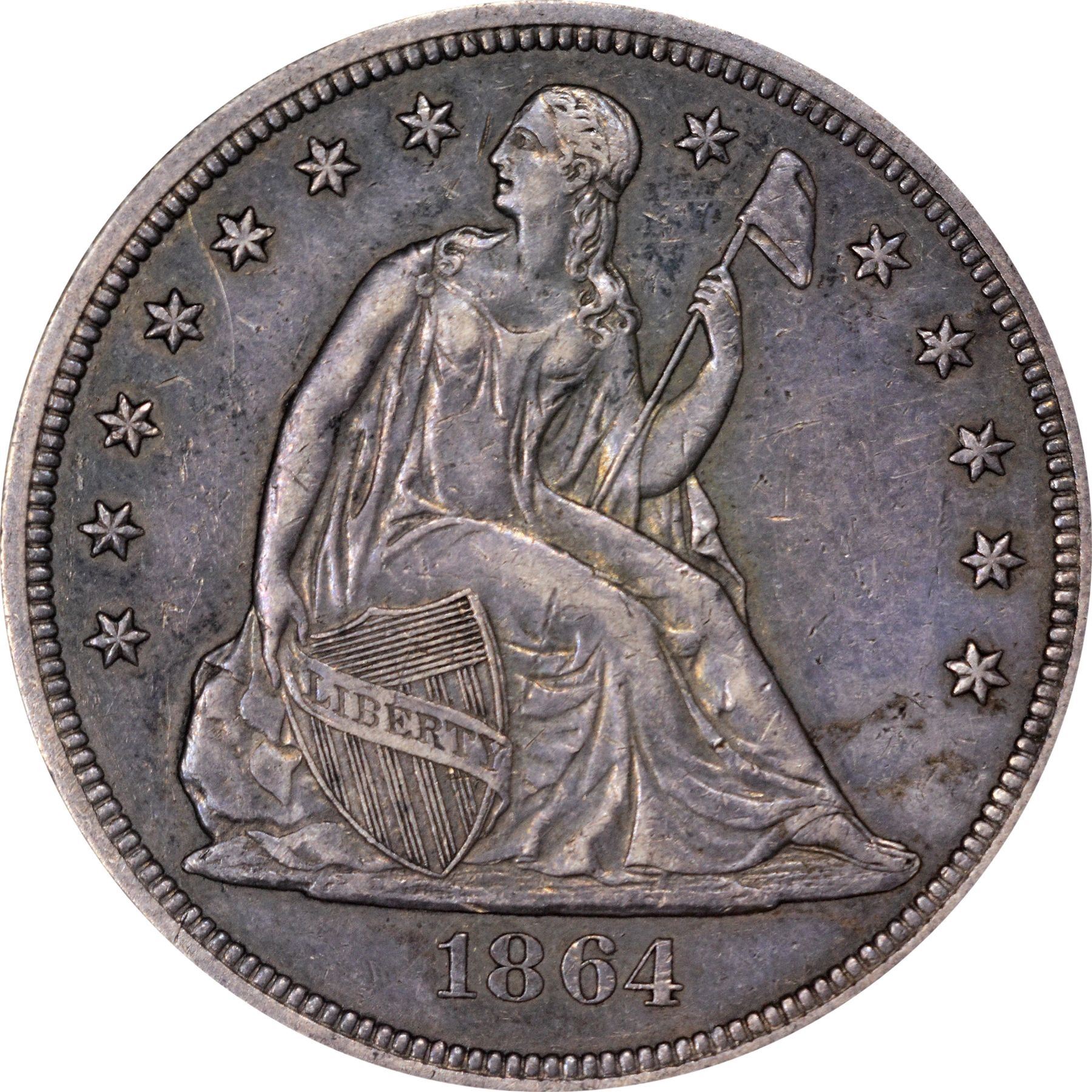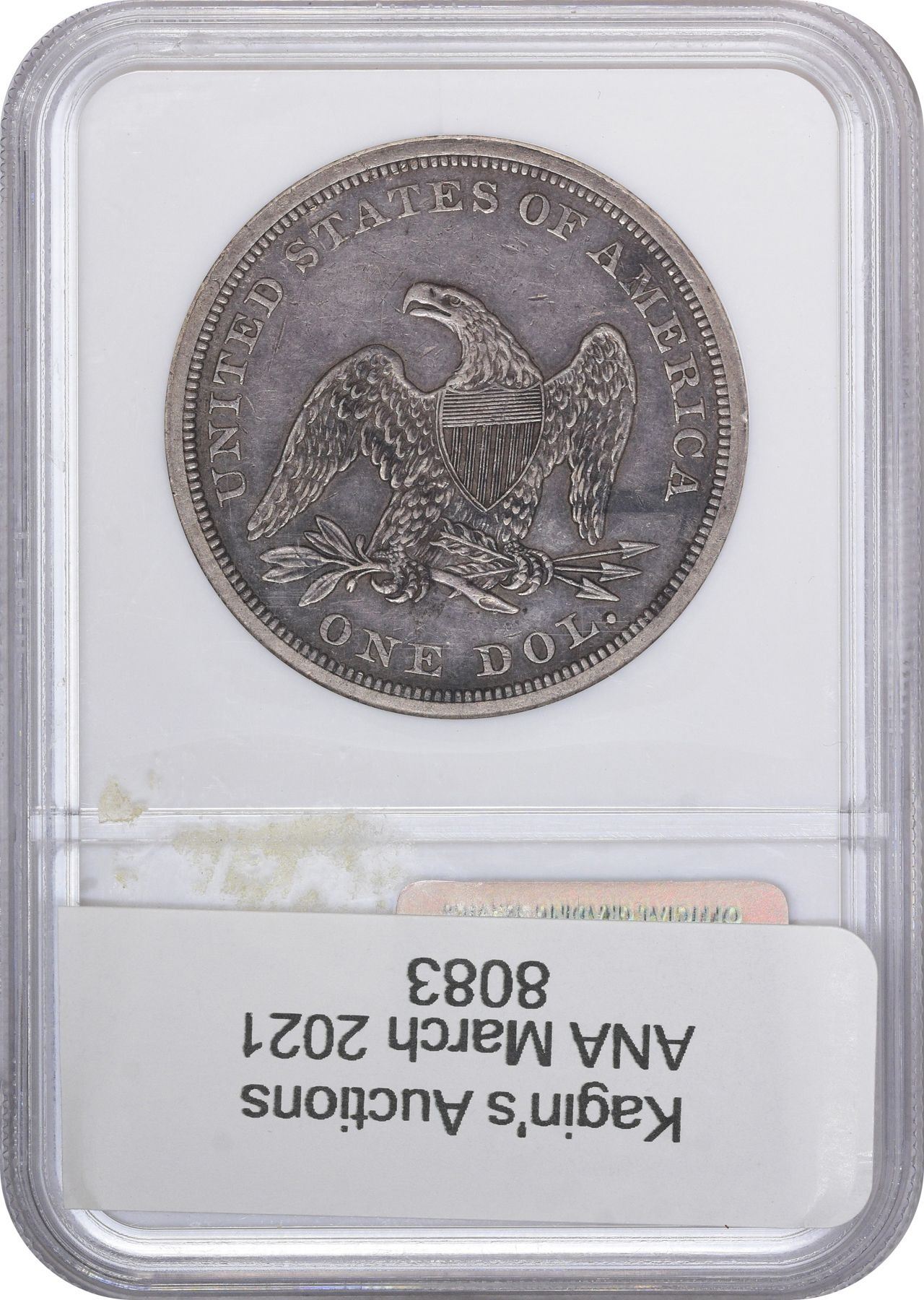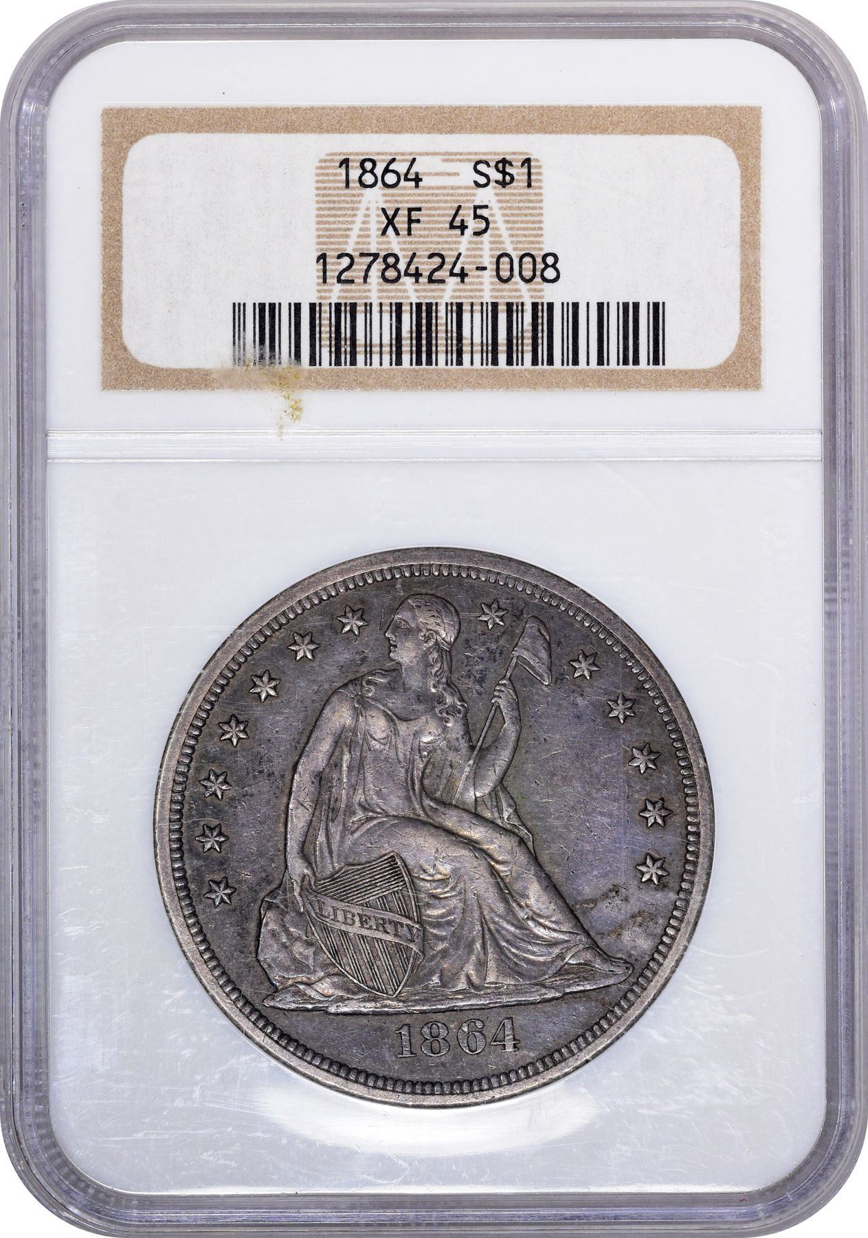 Description: The warm blue-gray surfaces of this popular Civil War-era issue are adorned with deeper slate-blue in the protected design areas, and with lighter silver-gray design high points. Additionally, some charcoal toning is noted on the reverse. The sharp design features of this attractive Liberty Seated dollar offer little in the way of wear or contact marks, especially to the unaided eye. Choice for the grade.