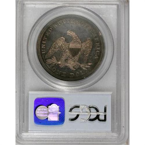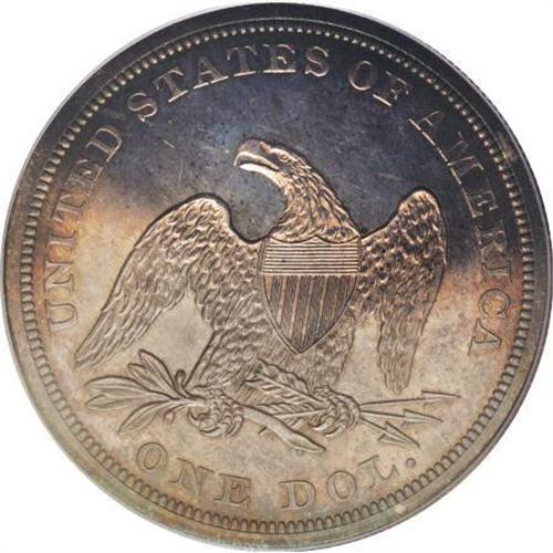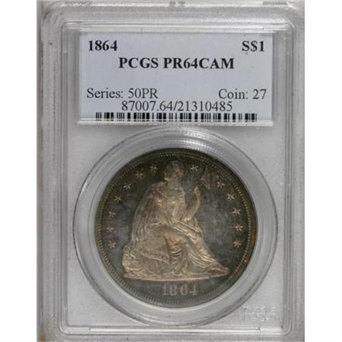 <B>1864 $1 PR64 Cameo PCGS.</B></I> The 1864 dollar saw a mintage of 470 proofs, a relatively large number of which have apparently survived. Examples designated as Cameos are a different story, judging by the 25 or so graded by PCGS and NGC. This near-Gem reveals pleasing field-motif contrast, and been in receipt of an impressive strike. Delicate cobalt-blue, lavender, and golden-brown patina visits both sides, accentuating the coin's overall eye appeal. Faint roller marks are noted on parts of Liberty's portrait. Population: 6 in 64 Cameo, 1 finer (9/07).<BR><BR><b>Shipping:</b> Coins & Currency (<a target="_blank" href="http://www.heritageauctions.com/common/shipping.php">view shipping information</a>)