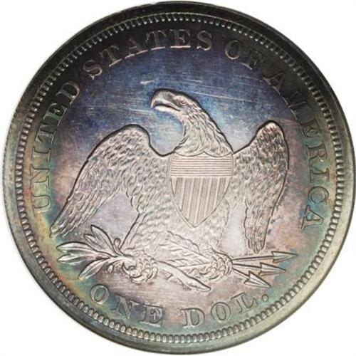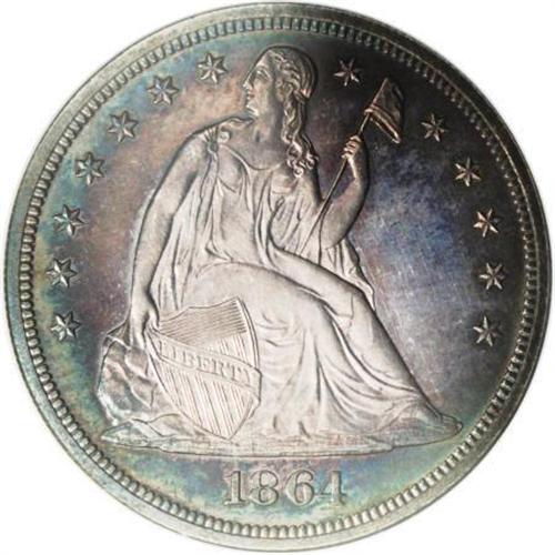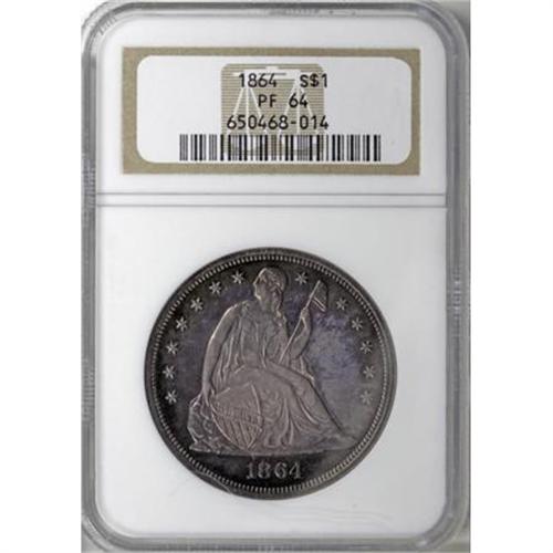 <B>1864 $1 PR64 NGC.</B></I> This exceptional Choice specimen shows strongly reflective fields through delicate layers of patina, rose-gray in the centers and sea-green at the margins. The 1864 silver dollar had a proof mintage of just 470 pieces, and near-Gem and better examples remain elusive today. NGC has graded 29 finer representatives (8/07).<BR><BR><B>Coin Engraver:</B> Christian Gobrecht<BR><BR><b>Shipping:</b> Coins & Currency (<a target="_blank" href="http://www.heritageauctions.com/common/shipping.php">view shipping information</a>)