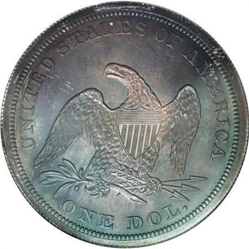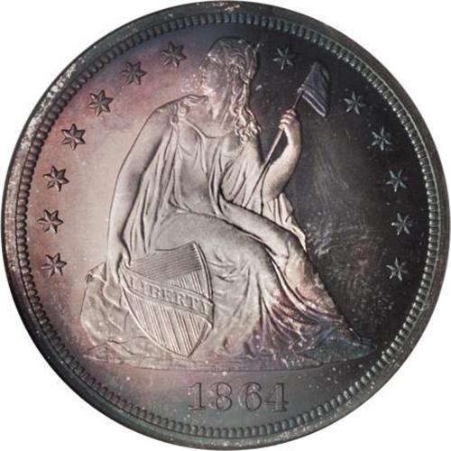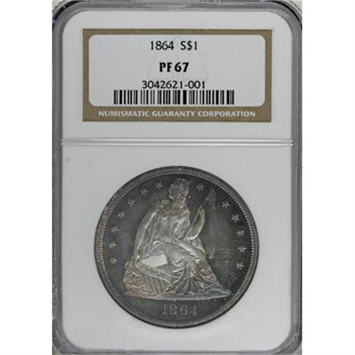 <B>1864 $1 PR67 NGC.</B></I> A window of brilliance at the obverse center is bounded by ruby-lilac and jade-green shades. The reverse alternates between deep aquamarine and cherry-red toning. The strike is unimprovably precise, even on Liberty's hair and the nearby star centers. Careful rotation beneath a strong light fails to locate any surface imperfections. The Civil War date has a proof mintage of just 470 pieces, and the associated business strike emission of 30,700 pieces is also minimal. Unlike the circulation issue, proofs show no trace of repunching on the date. Census: 2 in 67, 3 finer (8/07).<BR><BR><B>Coin Engraver:</B> Christian Gobrecht<BR><BR><b>Shipping:</b> Coins & Currency (<a target="_blank" href="http://www.heritageauctions.com/common/shipping.php">view shipping information</a>)