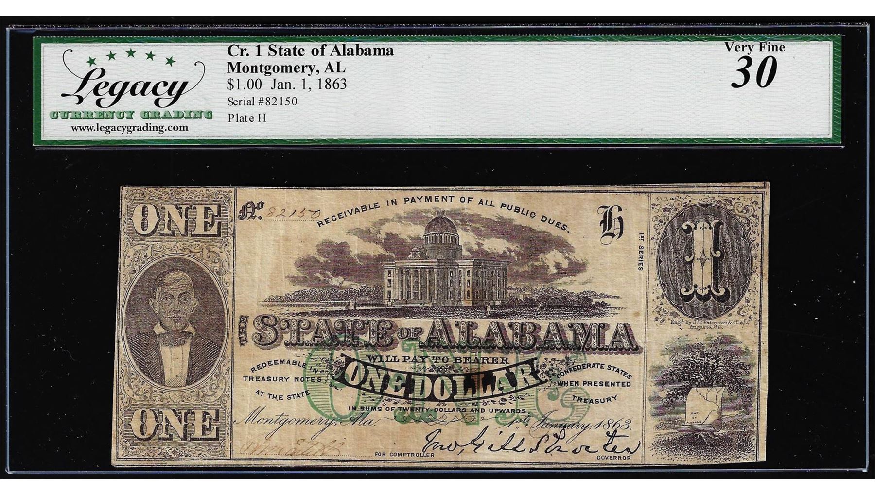 One 1864 $1 State of Alabama Montgomery, AL Obsolete Note Cr.1 Legacy Very Fine 30. Legacy Graded.