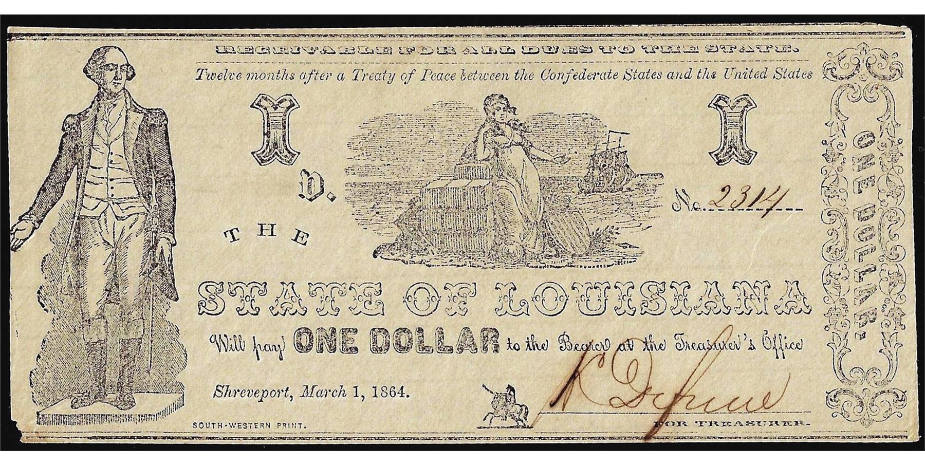 One 1864 $1 State of Louisiana Obsolete Note.