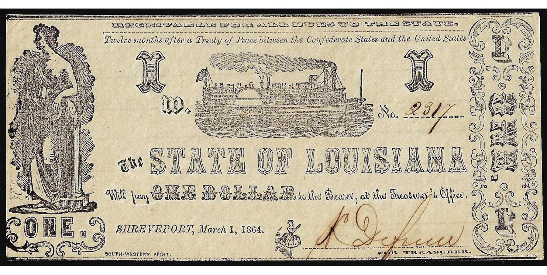 One 1864 $1 State of Louisiana Obsolete Note.