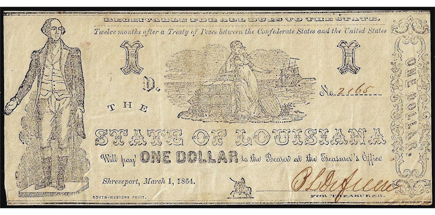 One 1864 $1 State of Louisiana Obsolete Note.