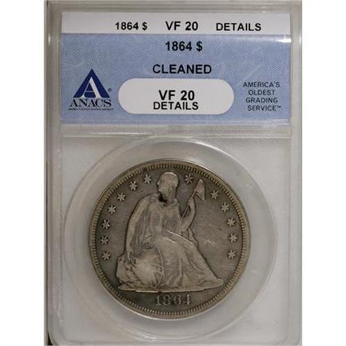 <B>1864 $1 --Cleaned--ANACS. VF20 Details.</B></I> NGC Census: (2/57). PCGS Population (1/100). Mintage: 30,700. Numismedia Wsl. Price for NGC/PCGS coin in VF20: $500. (#6954)<BR><BR><B>Coin Engraver:</B> Christian Gobrecht<BR><BR><b>Shipping:</b> Coins & Currency (<a target="_blank" href="http://www.heritageauctions.com/common/shipping.php">view shipping information</a>)