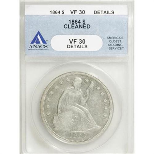 <B>1864 $1 --Cleaned--ANACS. VF30 Details.</B></I> NGC Census: (1/54). PCGS Population (2/96). Mintage: 30,700. Numismedia Wsl. Price for NGC/PCGS coin in VF30: $594. (#6954)<BR><BR><B>Coin Engraver:</B> Christian Gobrecht<BR><BR><b>Shipping:</b> Coins & Currency (<a target="_blank" href="http://www.heritageauctions.com/common/shipping.php">view shipping information</a>)