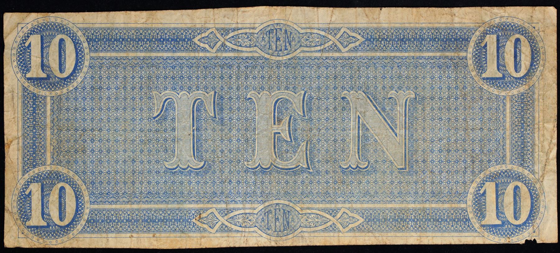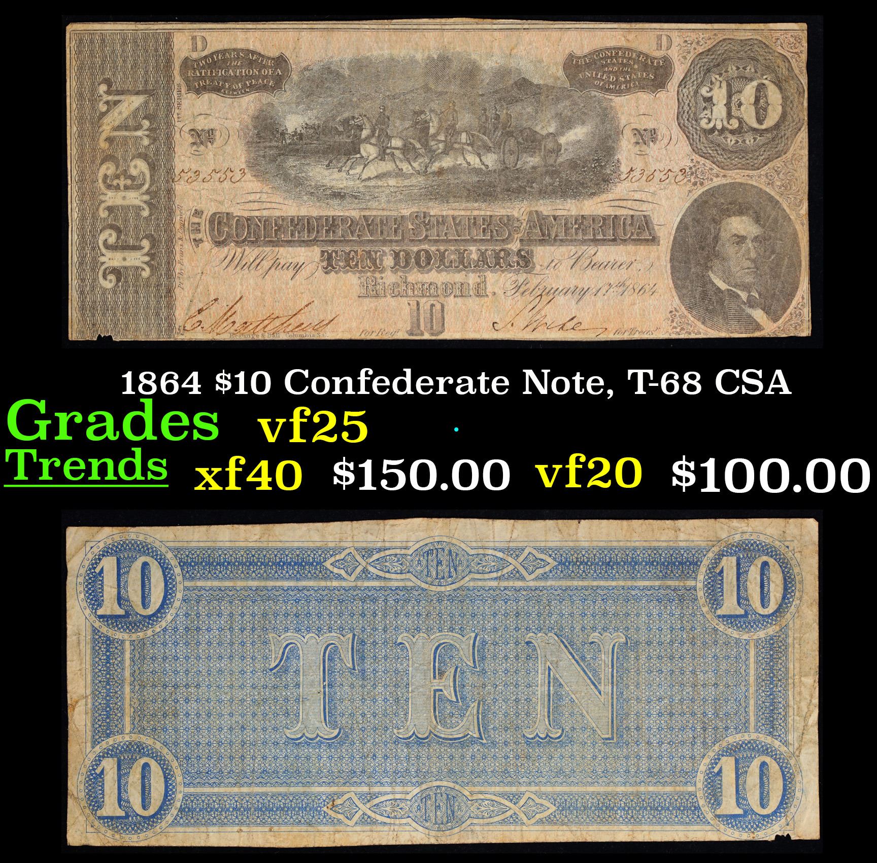 1864 $10 Confederate Note, T-68 CSA Grades vf+