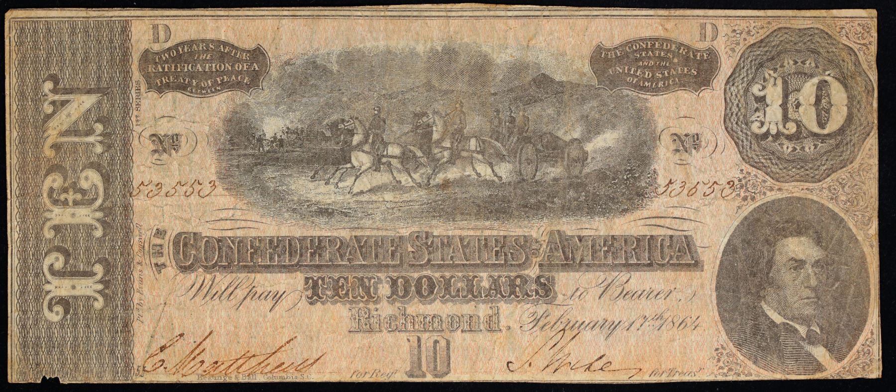 1864 $10 Confederate Note, T-68 CSA Grades vf+. Of great historical interest this is the last $10 currency notes issued by the Confederate States of America. The 7th and last issue of Confederate notes. Notes hand signed and numbered by Confederate soldiers and families. Printed and issued over 140 years ago during the Civil War. Depicts Confederate cabinet member Robert M. T. Hunter and features a detailed vignette of horse-drawn artillery. This large 7" x 3" Confederate $10 note is a genuine keepsake from one of the most significant periods in American history.