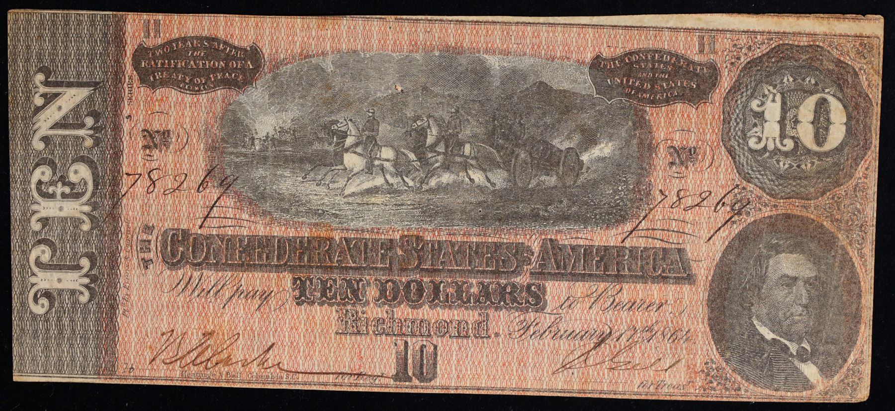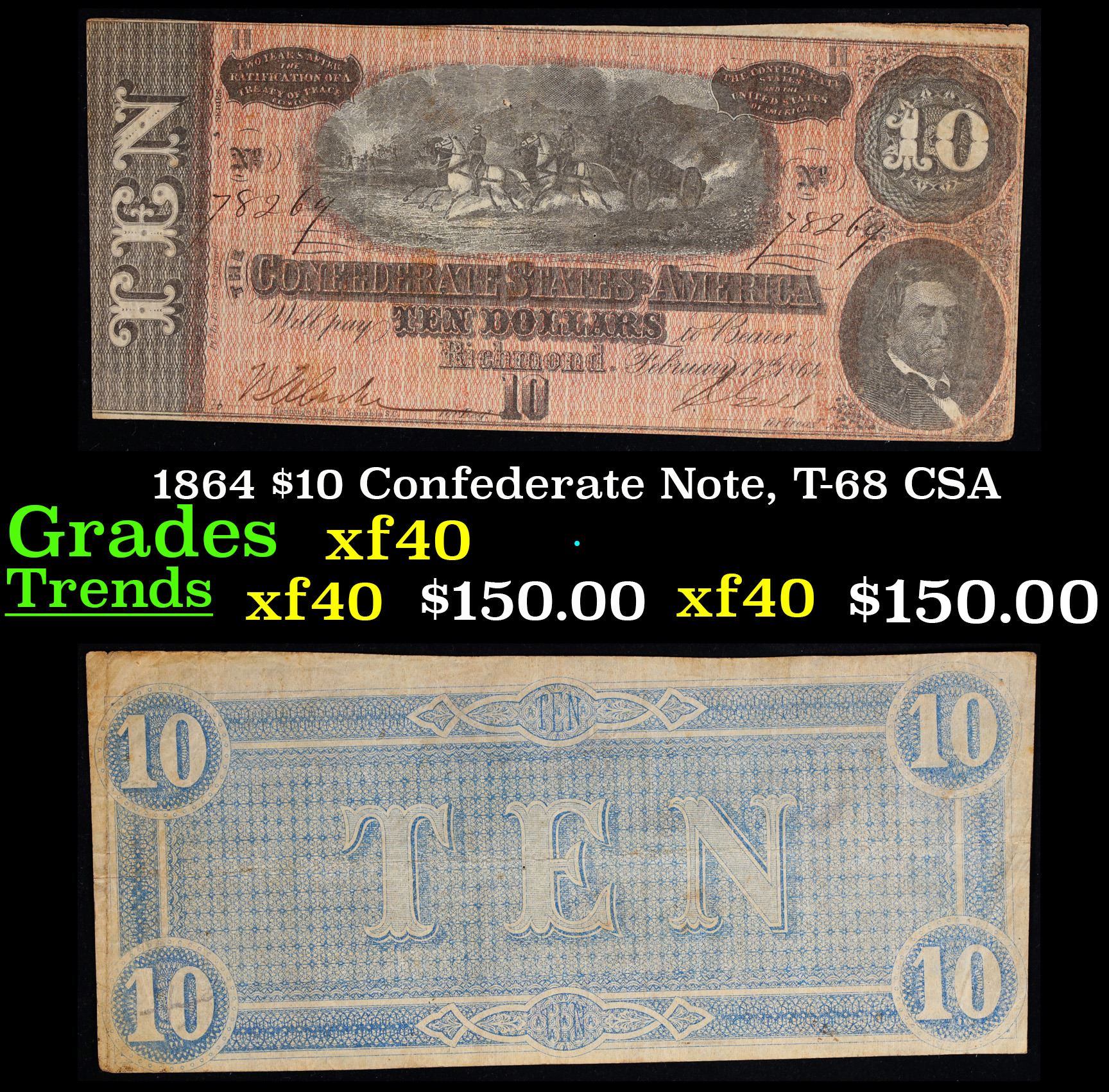 1864 $10 Confederate Note, T-68 CSA Grades xf. Of great historical interest this is the last $10 currency notes issued by the Confederate States of America. The 7th and last issue of Confederate notes. Notes hand signed and numbered by Confederate soldiers and families. Printed and issued over 140 years ago during the Civil War. Depicts Confederate cabinet member Robert M. T. Hunter and features a detailed vignette of horse-drawn artillery. This large 7" x 3" Confederate $10 note is a genuine keepsake from one of the most significant periods in American history.