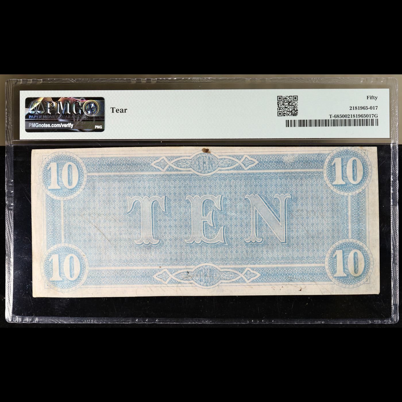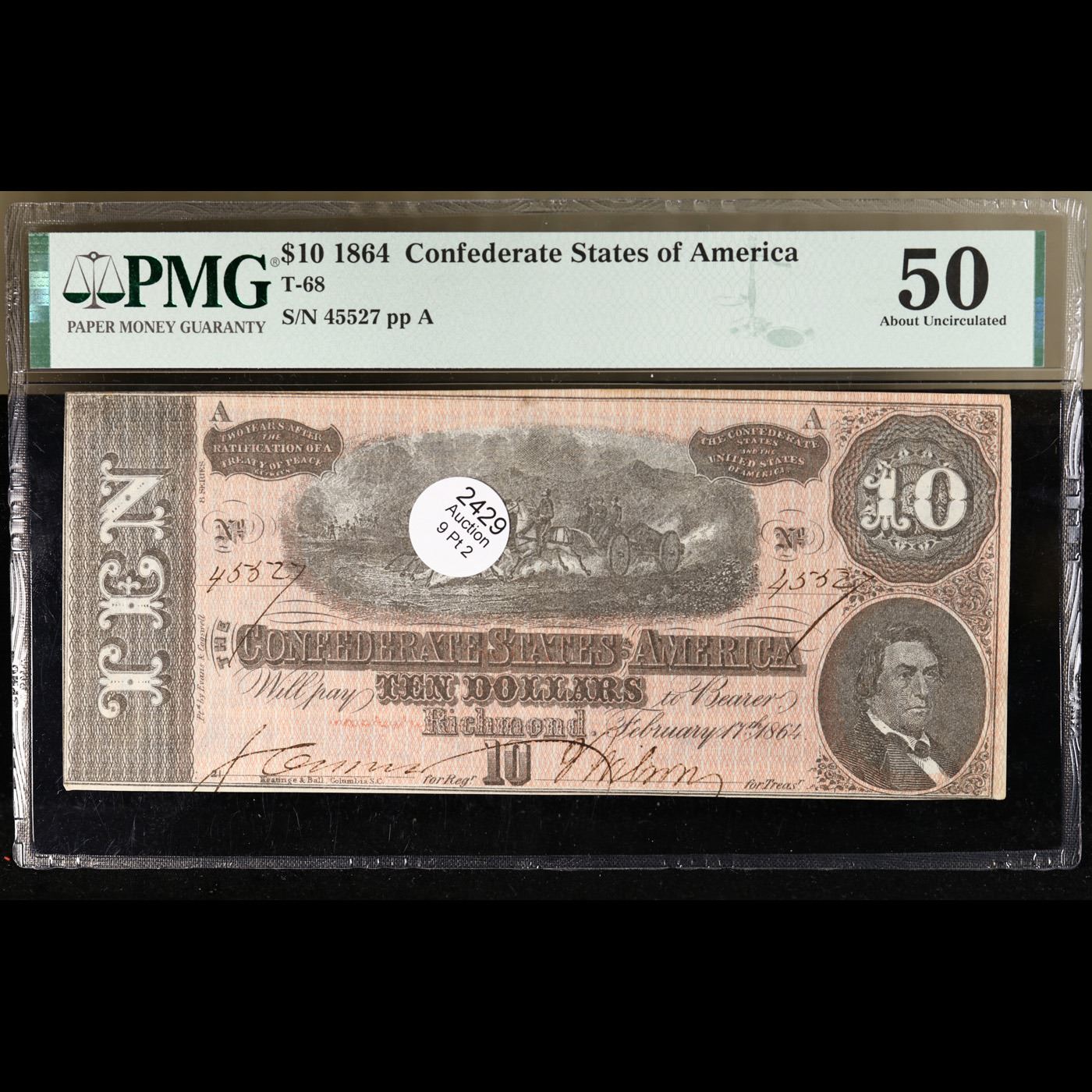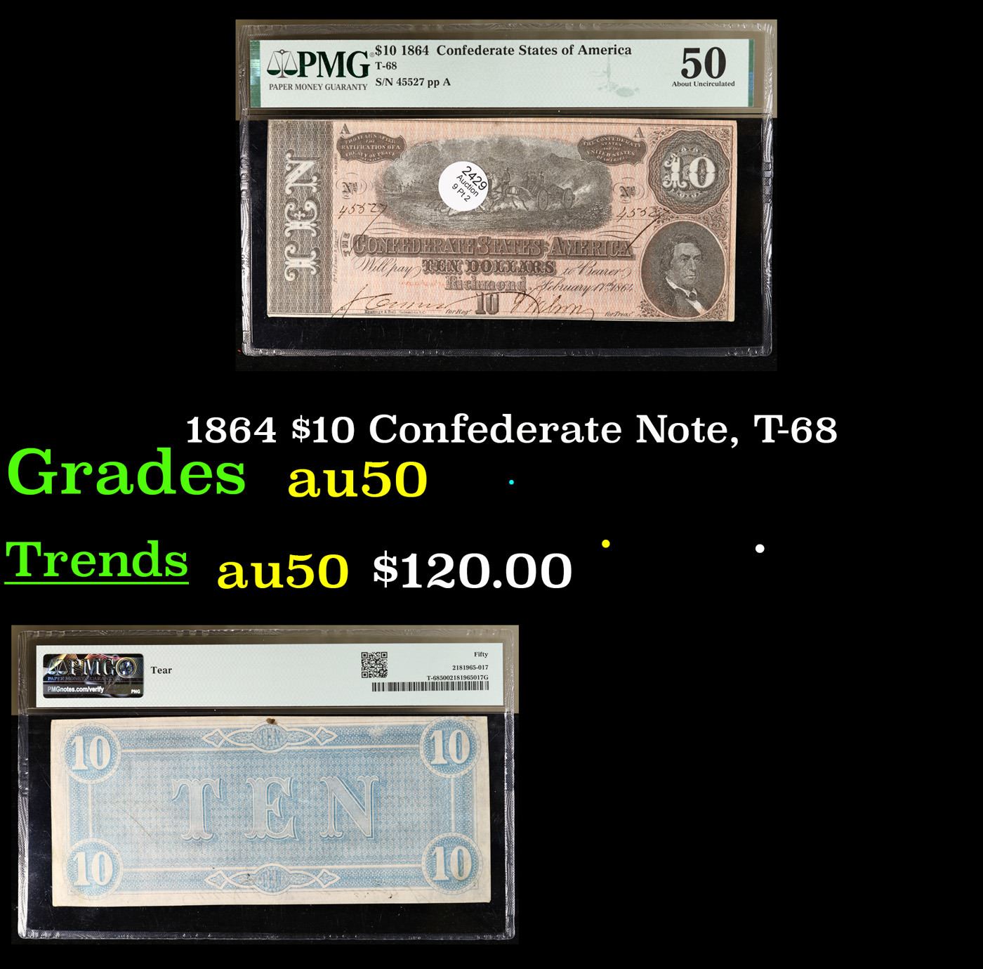 1864 $10 Confederate Note, T-68 Graded au50 By PMG