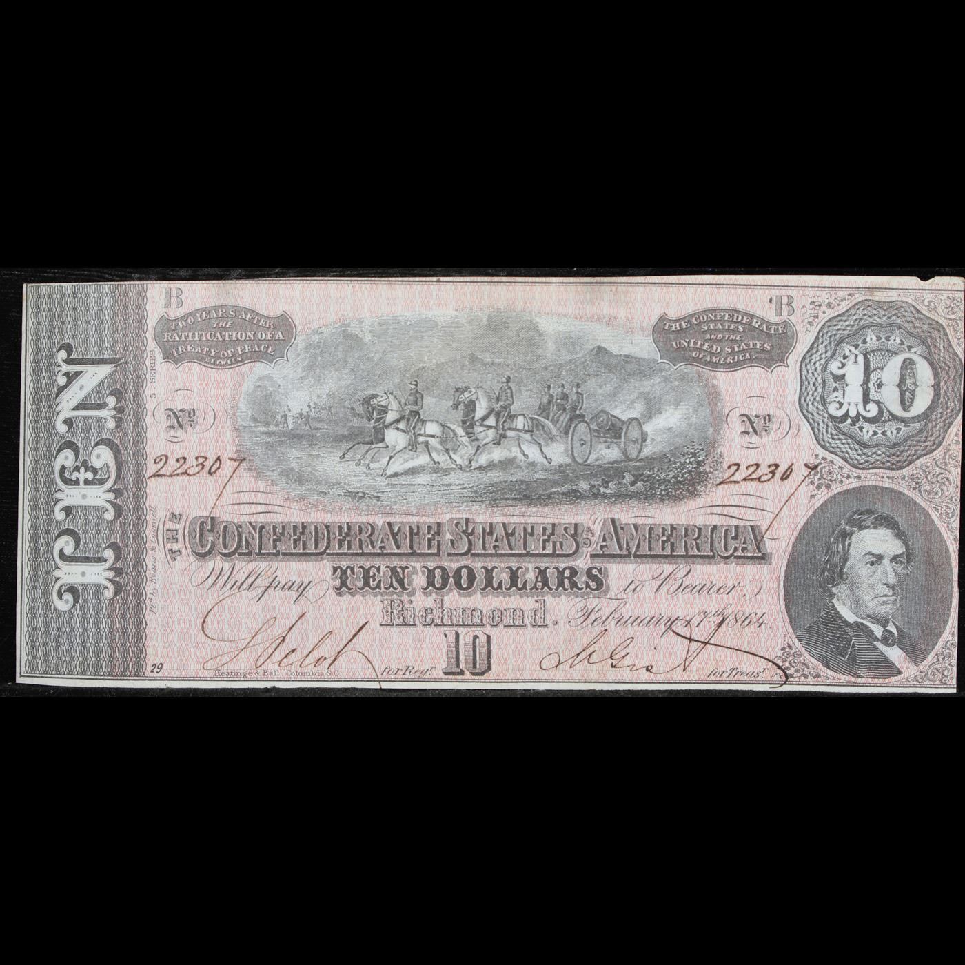 1864 $10 Confederate Note, T-68 Grades Select AU. Of great historical interest this is the last $10 currency notes issued by the Confederate States of America. The 7th and last issue of Confederate notes. Notes hand signed and numbered by Confederate soldiers and families. Printed and issued over 140 years ago during the Civil War. Depicts Confederate cabinet member Robert M. T. Hunter and features a detailed vignette of horse-drawn artillery. This large 7" x 3" Confederate $10 note is a genuine keepsake from one of the most significant periods in American history.