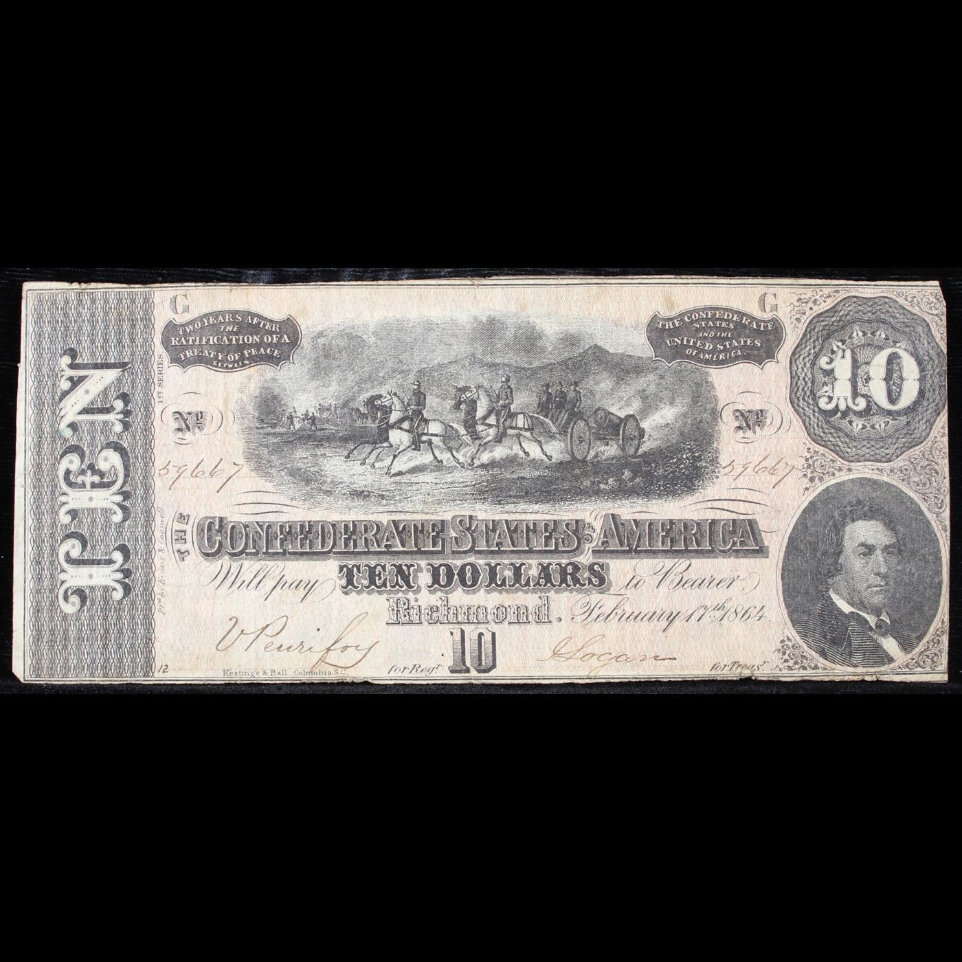 1864 $10 Confederate Note, T-68 Grades Select AU. Of great historical interest this is the last $10 currency notes issued by the Confederate States of America. The 7th and last issue of Confederate notes. Notes hand signed and numbered by Confederate soldiers and families. Printed and issued over 140 years ago during the Civil War. Depicts Confederate cabinet member Robert M. T. Hunter and features a detailed vignette of horse-drawn artillery. This large 7" x 3" Confederate $10 note is a genuine keepsake from one of the most significant periods in American history.