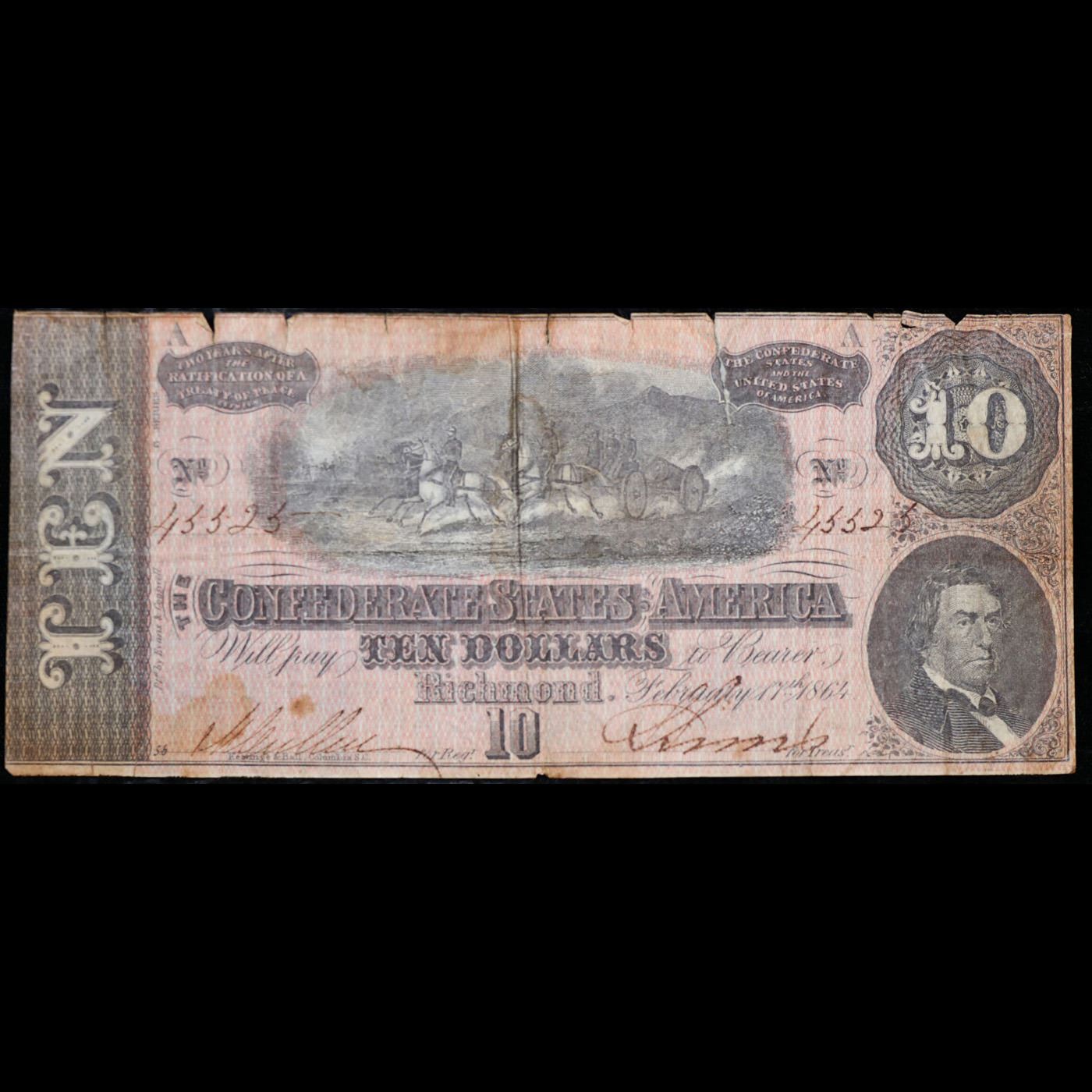 1864 $10 Confederate Note, T-68 Grades f, fine. Of great historical interest this is the last $10 currency notes issued by the Confederate States of America. The 7th and last issue of Confederate notes. Notes hand signed and numbered by Confederate soldiers and families. Printed and issued over 140 years ago during the Civil War. Depicts Confederate cabinet member Robert M. T. Hunter and features a detailed vignette of horse-drawn artillery. This large 7" x 3" Confederate $10 note is a genuine keepsake from one of the most significant periods in American history.