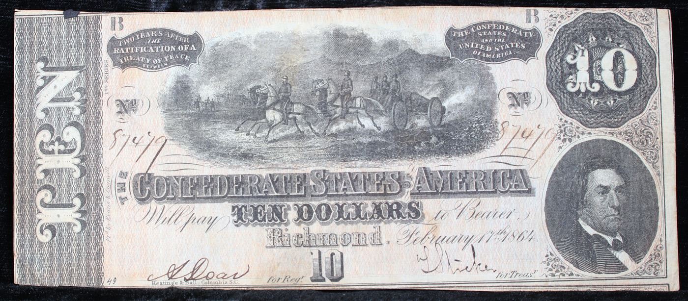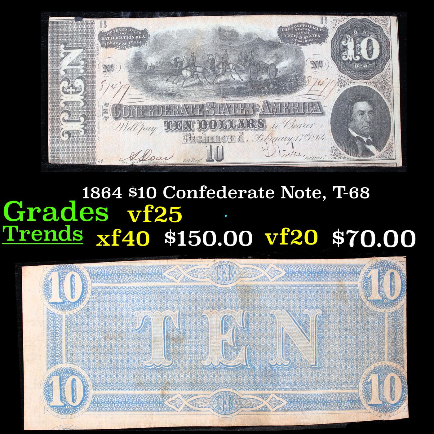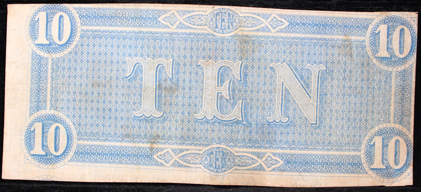 1864 $10 Confederate Note, T-68 Grades vf+. Of great historical interest this is the last $10 currency notes issued by the Confederate States of America. The 7th and last issue of Confederate notes. Notes hand signed and numbered by Confederate soldiers and families. Printed and issued over 140 years ago during the Civil War. Depicts Confederate cabinet member Robert M. T. Hunter and features a detailed vignette of horse-drawn artillery. This large 7" x 3" Confederate $10 note is a genuine keepsake from one of the most significant periods in American history.
