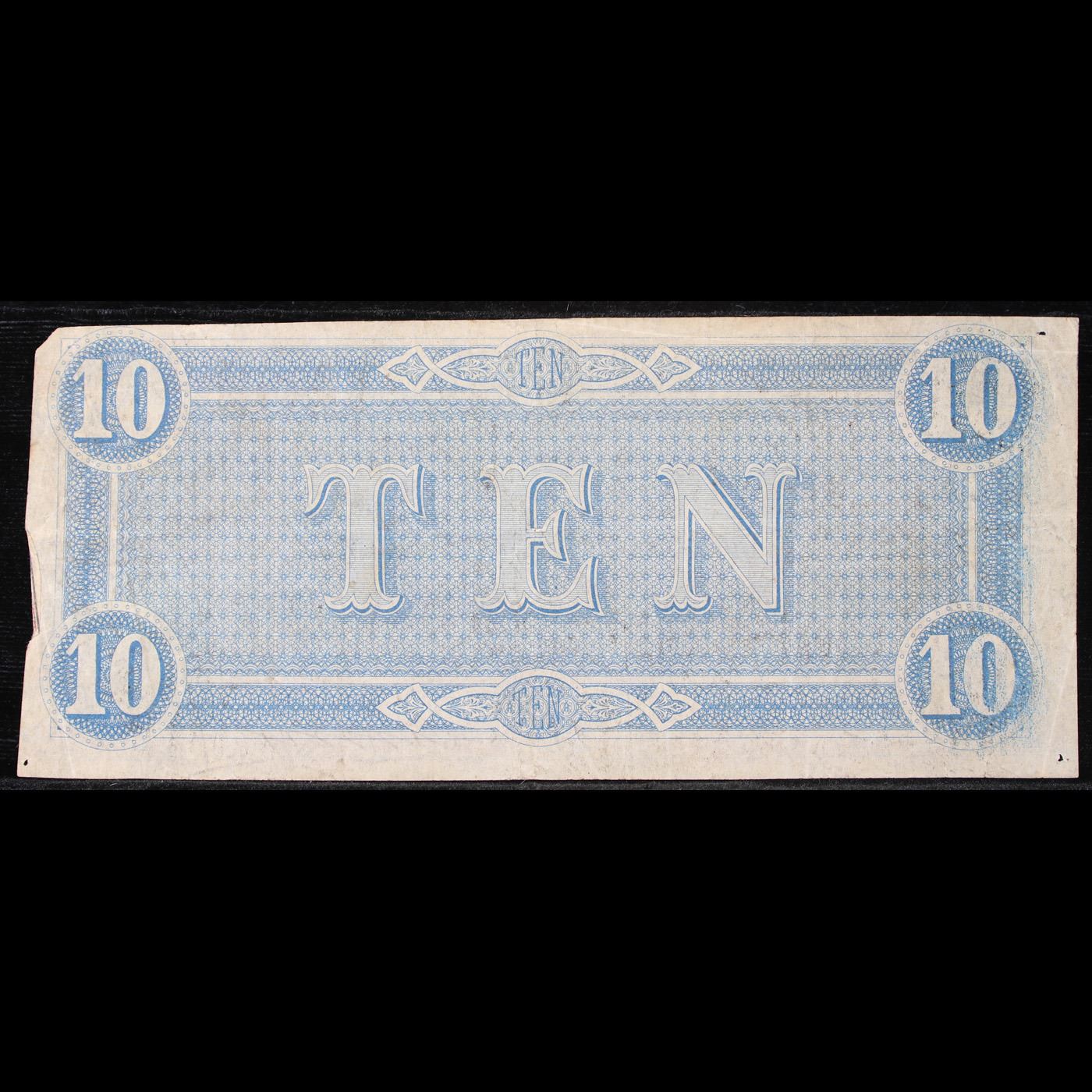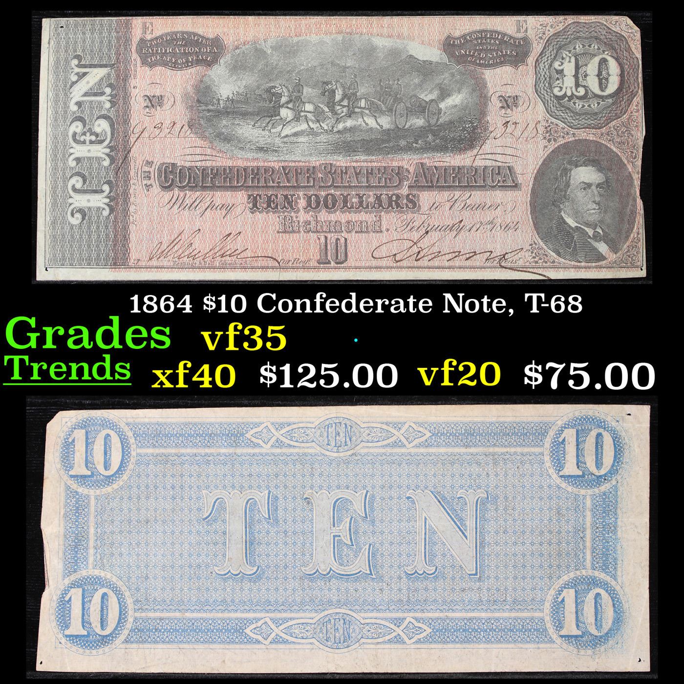 1864 $10 Confederate Note, T-68 Grades vf++. Of great historical interest this is the last $10 currency notes issued by the Confederate States of America. The 7th and last issue of Confederate notes. Notes hand signed and numbered by Confederate soldiers and families. Printed and issued over 140 years ago during the Civil War. Depicts Confederate cabinet member Robert M. T. Hunter and features a detailed vignette of horse-drawn artillery. This large 7" x 3" Confederate $10 note is a genuine keepsake from one of the most significant periods in American history.