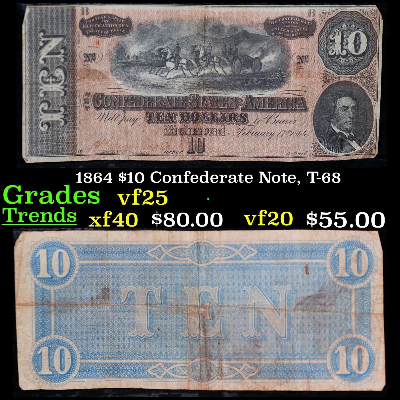 1864 $10 Confederate Note, T-68 Grades vf+
