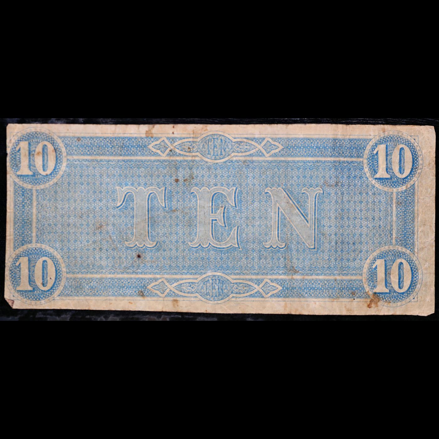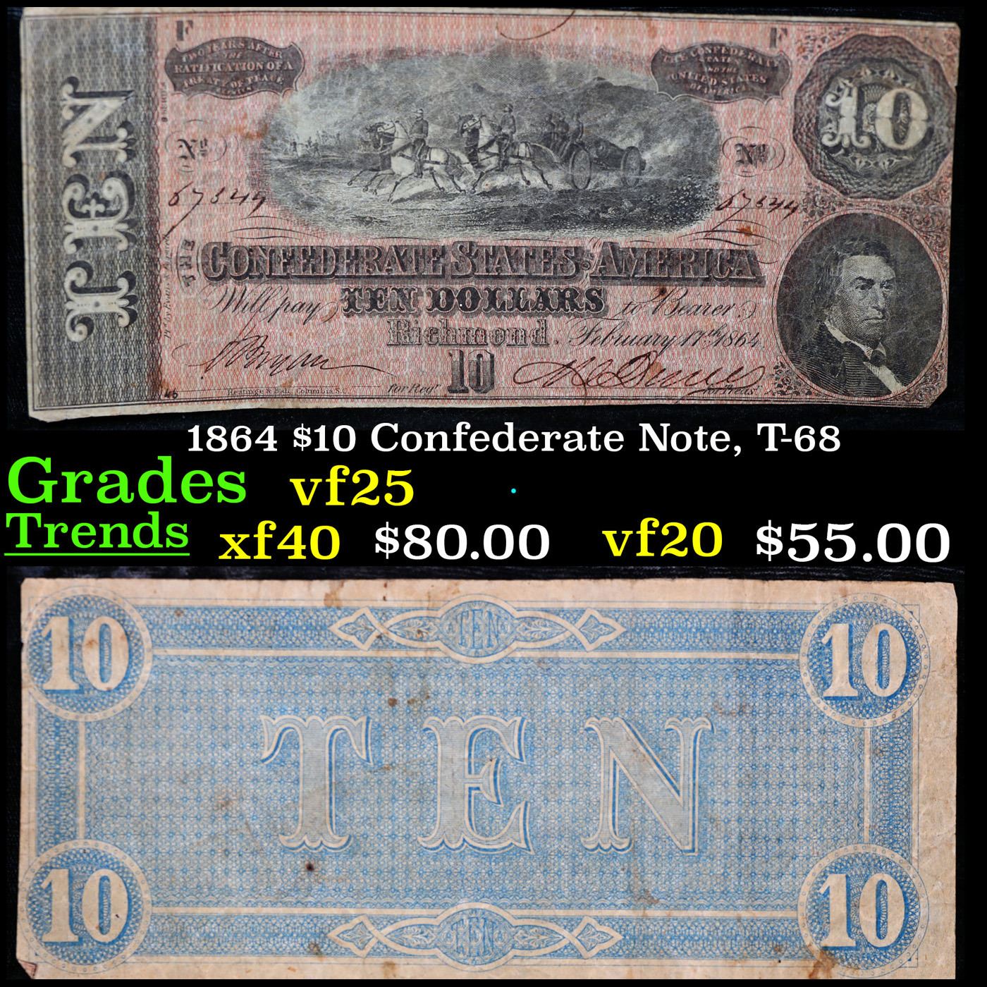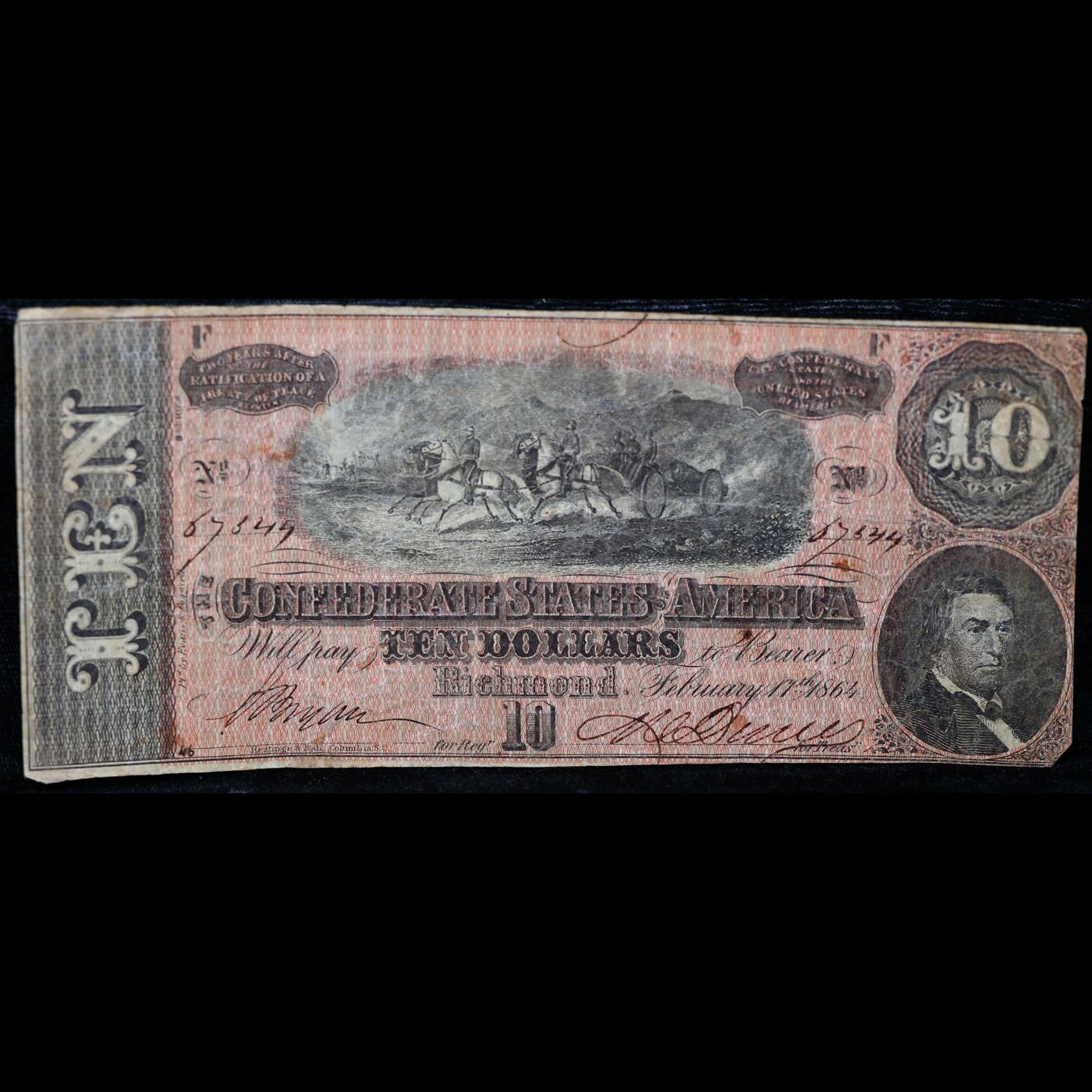 1864 $10 Confederate Note, T-68 Grades vf+. Of great historical interest this is the last $10 currency notes issued by the Confederate States of America. The 7th and last issue of Confederate notes. Notes hand signed and numbered by Confederate soldiers and families. Printed and issued over 140 years ago during the Civil War. Depicts Confederate cabinet member Robert M. T. Hunter and features a detailed vignette of horse-drawn artillery. This large 7" x 3" Confederate $10 note is a genuine keepsake from one of the most significant periods in American history.