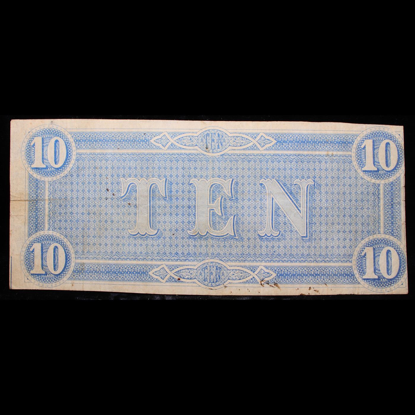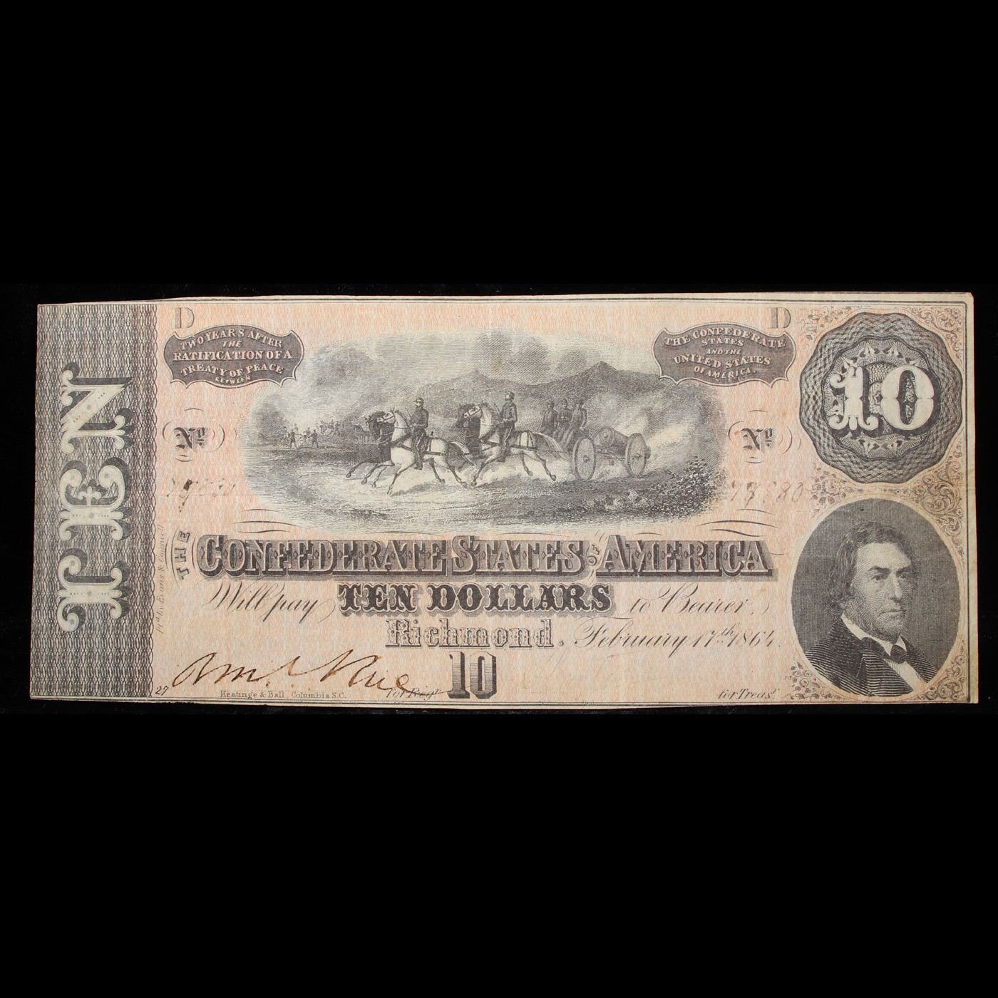 1864 $10 Confederate Note, T-68 Grades xf+. Of great historical interest this is the last $10 currency notes issued by the Confederate States of America. The 7th and last issue of Confederate notes. Notes hand signed and numbered by Confederate soldiers and families. Printed and issued over 140 years ago during the Civil War. Depicts Confederate cabinet member Robert M. T. Hunter and features a detailed vignette of horse-drawn artillery. This large 7" x 3" Confederate $10 note is a genuine keepsake from one of the most significant periods in American history.