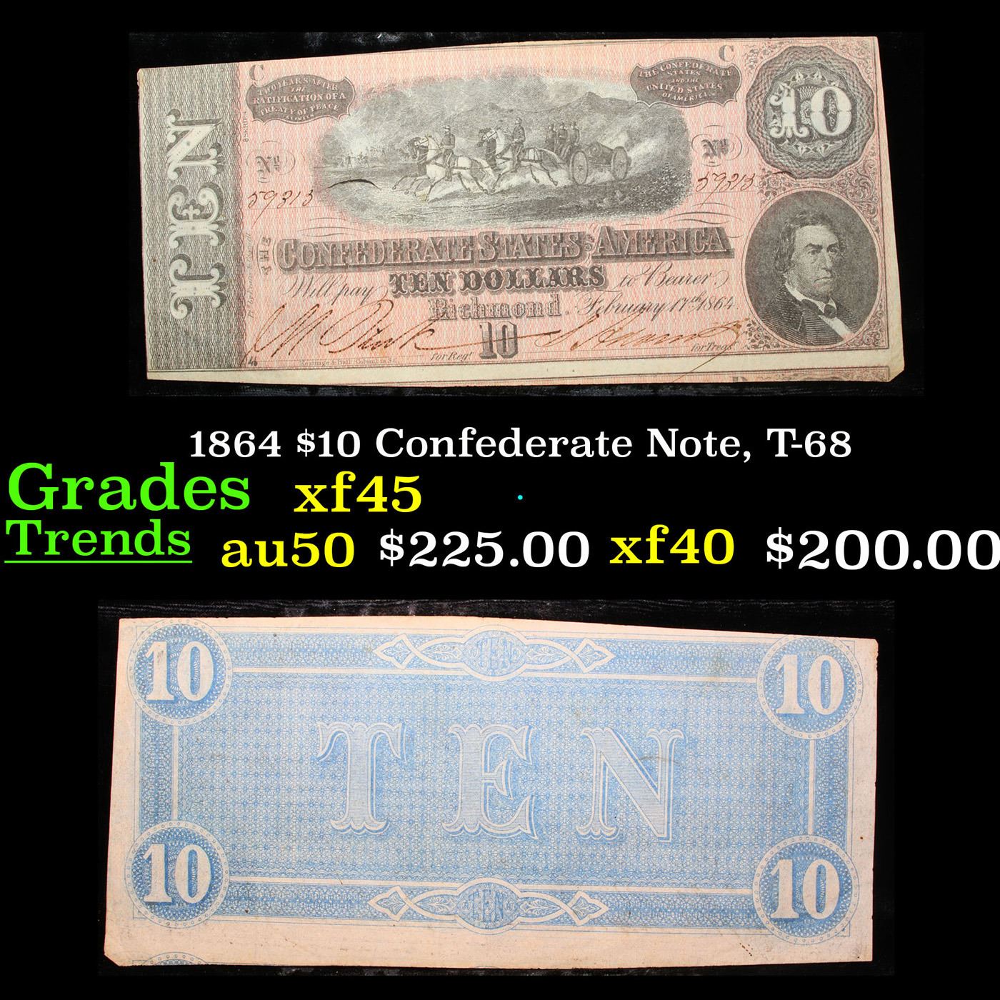 1864 $10 Confederate Note, T-68 Grades xf+