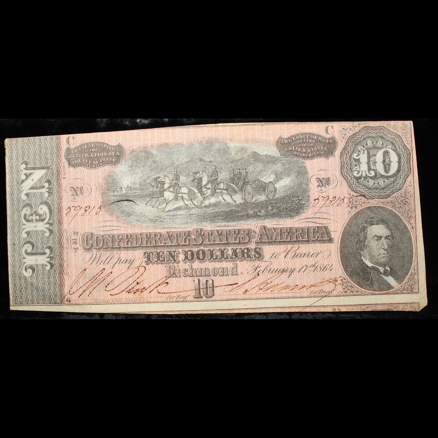 1864 $10 Confederate Note, T-68 Grades xf+. Of great historical interest this is the last $10 currency notes issued by the Confederate States of America. The 7th and last issue of Confederate notes. Notes hand signed and numbered by Confederate soldiers and families. Printed and issued over 140 years ago during the Civil War. Depicts Confederate cabinet member Robert M. T. Hunter and features a detailed vignette of horse-drawn artillery. This large 7" x 3" Confederate $10 note is a genuine keepsake from one of the most significant periods in American history.