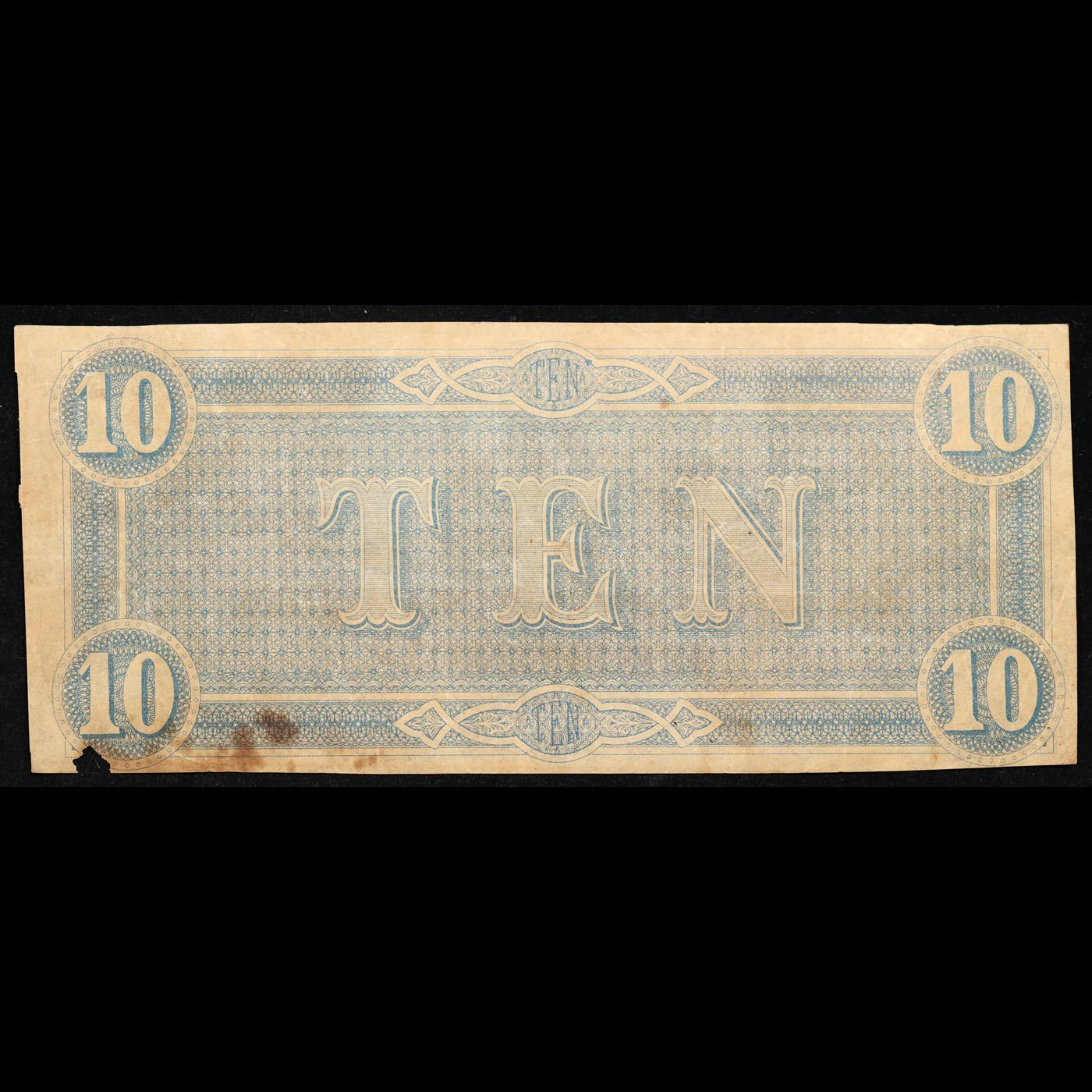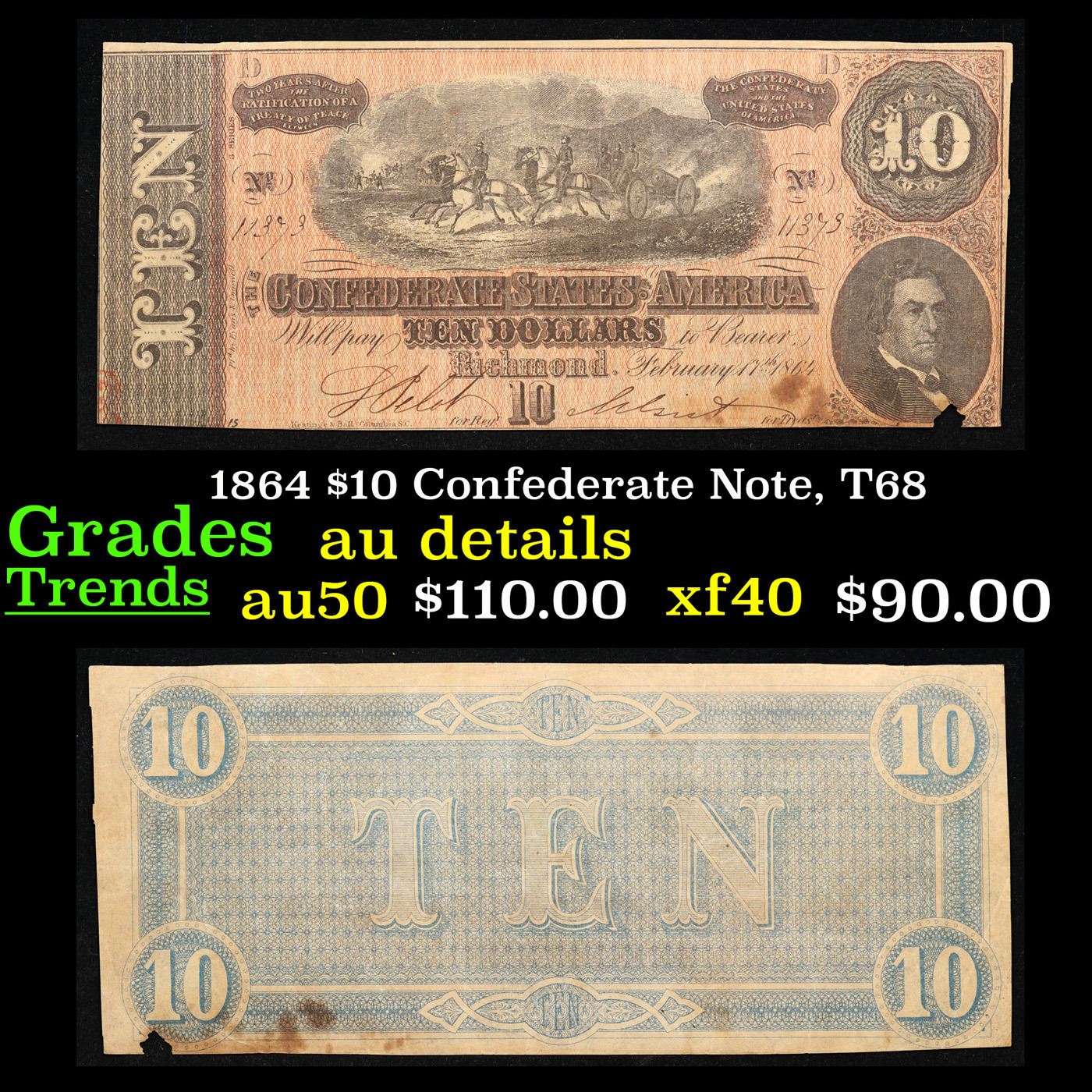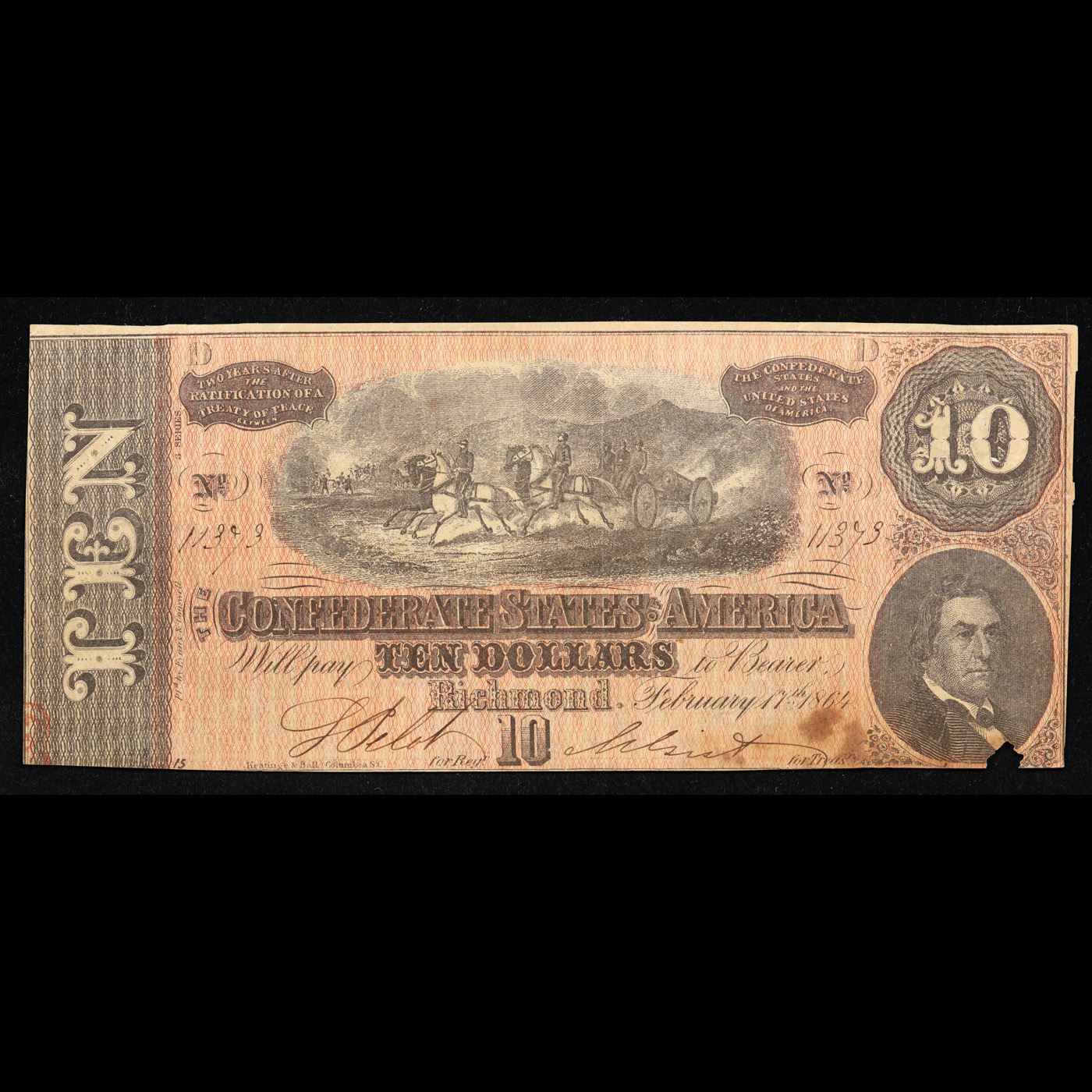 1864 $10 Confederate Note, T68 Grades AU Details. Of great historical interest this is the last $10 currency notes issued by the Confederate States of America. The 7th and last issue of Confederate notes. Notes hand signed and numbered by Confederate soldiers and families. Printed and issued over 140 years ago during the Civil War. Depicts Confederate cabinet member Robert M. T. Hunter and features a detailed vignette of horse-drawn artillery. This large 7" x 3" Confederate $10 note is a genuine keepsake from one of the most significant periods in American history.
