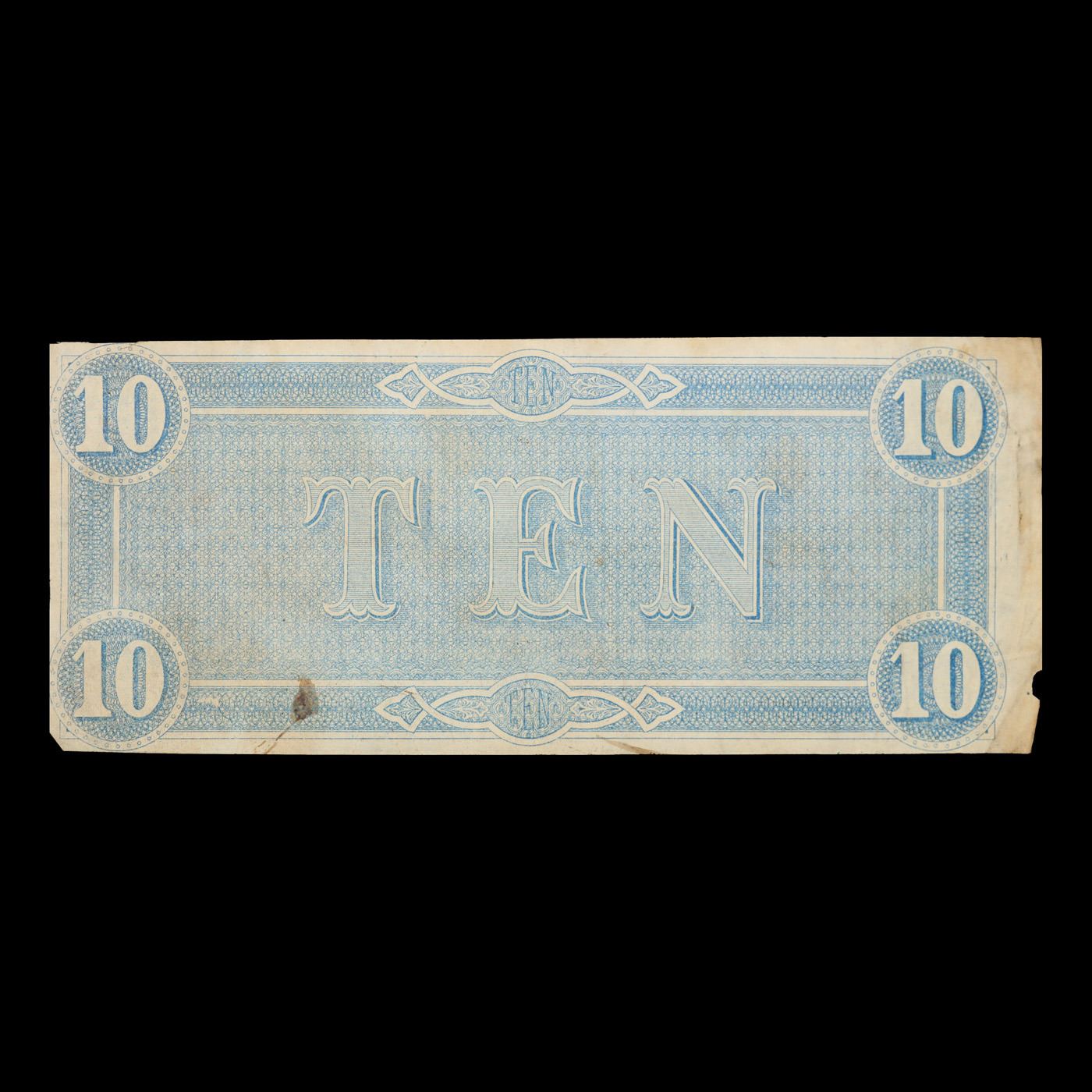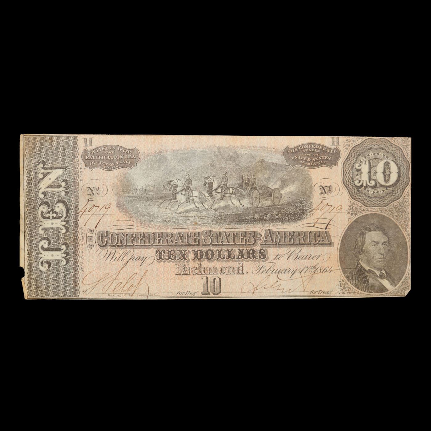 1864 $10 Confederate Note, T68 Grades Choice AU/BU Slider. Of great historical interest this is the last $10 currency notes issued by the Confederate States of America. The 7th and last issue of Confederate notes. Notes hand signed and numbered by Confederate soldiers and families. Printed and issued over 140 years ago during the Civil War. Depicts Confederate cabinet member Robert M. T. Hunter and features a detailed vignette of horse-drawn artillery. This large 7" x 3" Confederate $10 note is a genuine keepsake from one of the most significant periods in American history.