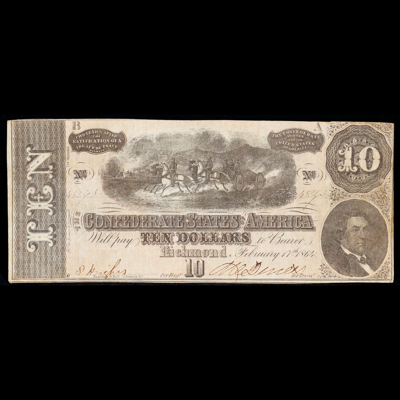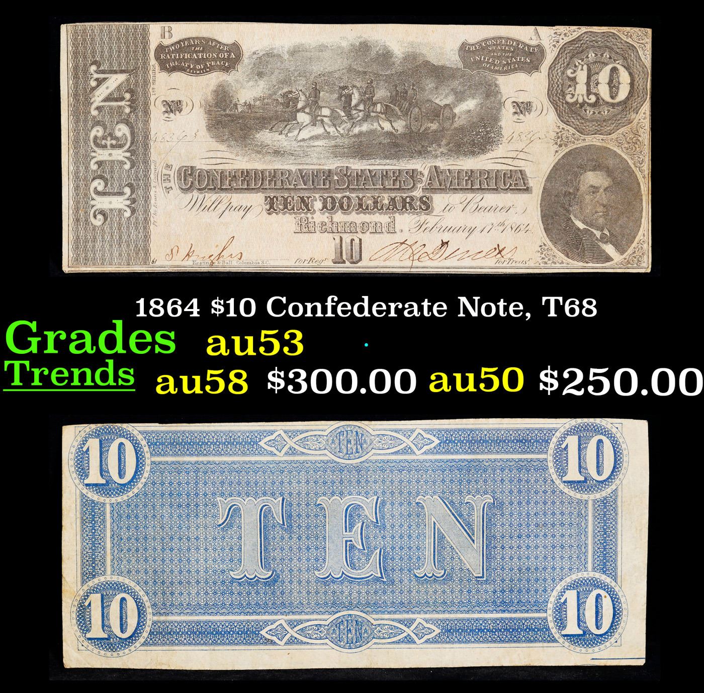 1864 $10 Confederate Note, T68 Grades Select AU. Of great historical interest this is the last $10 currency notes issued by the Confederate States of America. The 7th and last issue of Confederate notes. Notes hand signed and numbered by Confederate soldiers and families. Printed and issued over 140 years ago during the Civil War. Depicts Confederate cabinet member Robert M. T. Hunter and features a detailed vignette of horse-drawn artillery. This large 7" x 3" Confederate $10 note is a genuine keepsake from one of the most significant periods in American history.