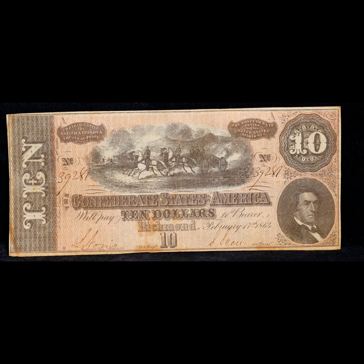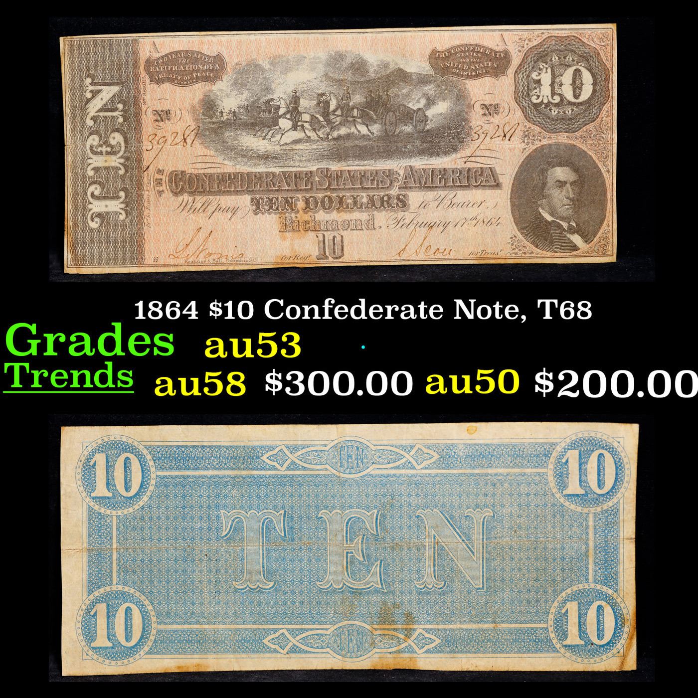 1864 $10 Confederate Note, T68 Grades Select AU. Of great historical interest this is the last $10 currency notes issued by the Confederate States of America. The 7th and last issue of Confederate notes. Notes hand signed and numbered by Confederate soldiers and families. Printed and issued over 140 years ago during the Civil War. Depicts Confederate cabinet member Robert M. T. Hunter and features a detailed vignette of horse-drawn artillery. This large 7" x 3" Confederate $10 note is a genuine keepsake from one of the most significant periods in American history.