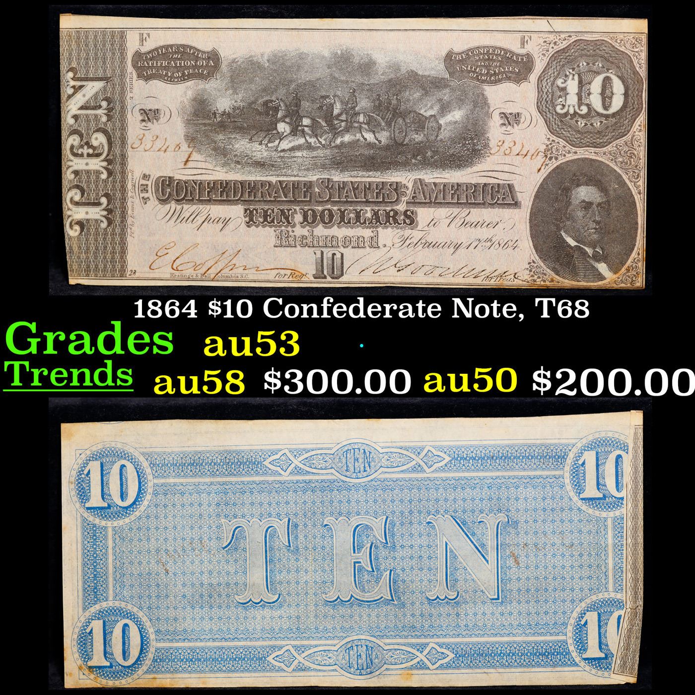 1864 $10 Confederate Note, T68 Grades Select AU. Of great historical interest this is the last $10 currency notes issued by the Confederate States of America. The 7th and last issue of Confederate notes. Notes hand signed and numbered by Confederate soldiers and families. Printed and issued over 140 years ago during the Civil War. Depicts Confederate cabinet member Robert M. T. Hunter and features a detailed vignette of horse-drawn artillery. This large 7" x 3" Confederate $10 note is a genuine keepsake from one of the most significant periods in American history.