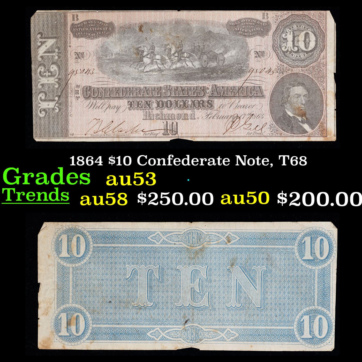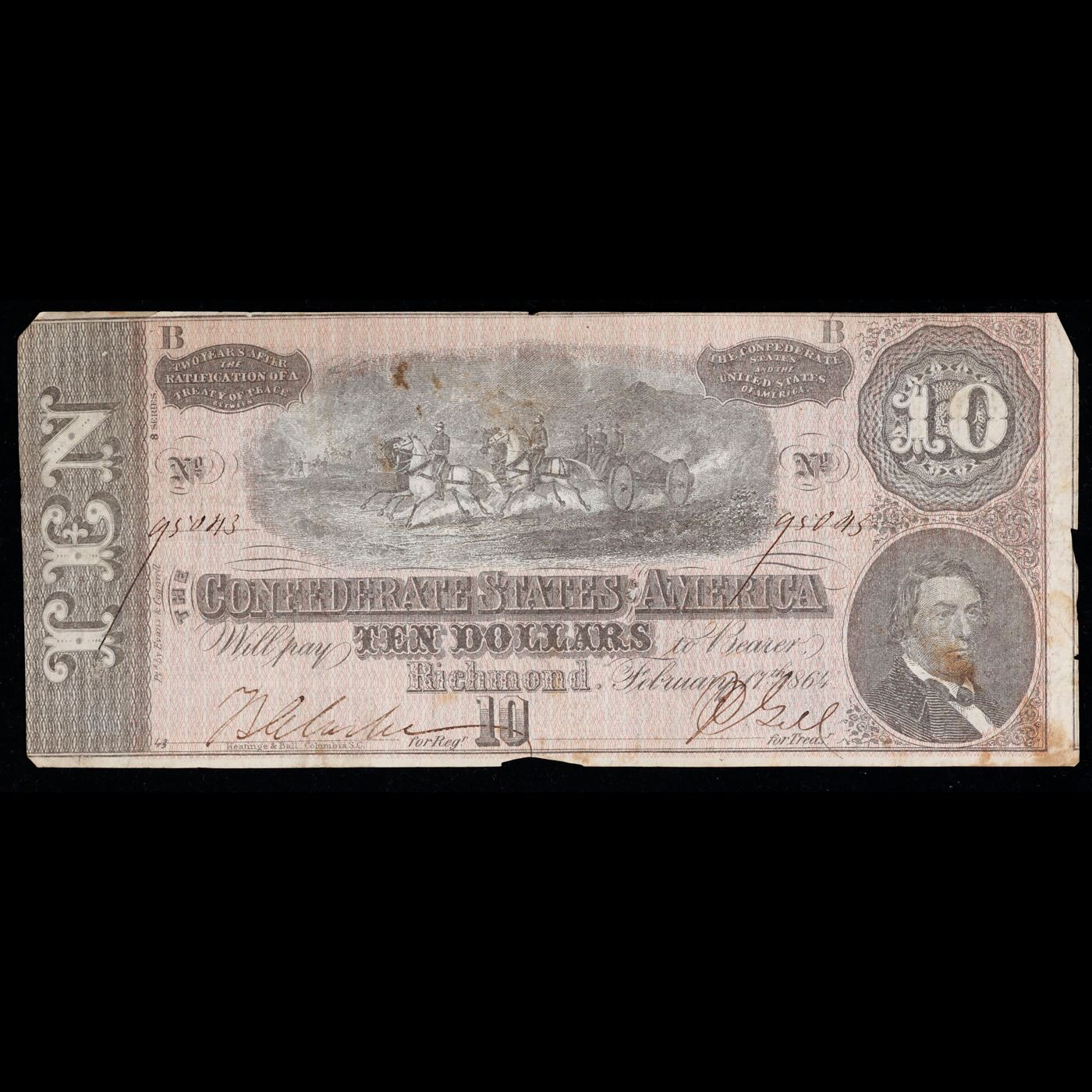 1864 $10 Confederate Note, T68 Grades Select AU. Of great historical interest this is the last $10 currency notes issued by the Confederate States of America. The 7th and last issue of Confederate notes. Notes hand signed and numbered by Confederate soldiers and families. Printed and issued over 140 years ago during the Civil War. Depicts Confederate cabinet member Robert M. T. Hunter and features a detailed vignette of horse-drawn artillery. This large 7" x 3" Confederate $10 note is a genuine keepsake from one of the most significant periods in American history.