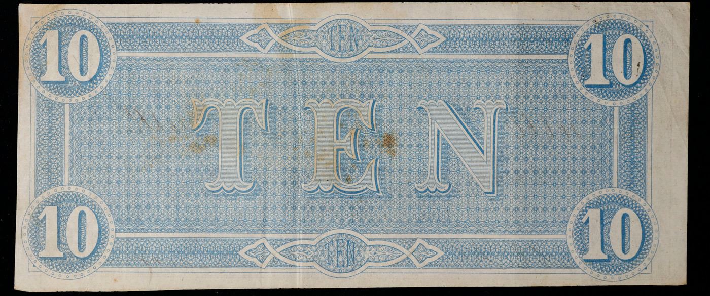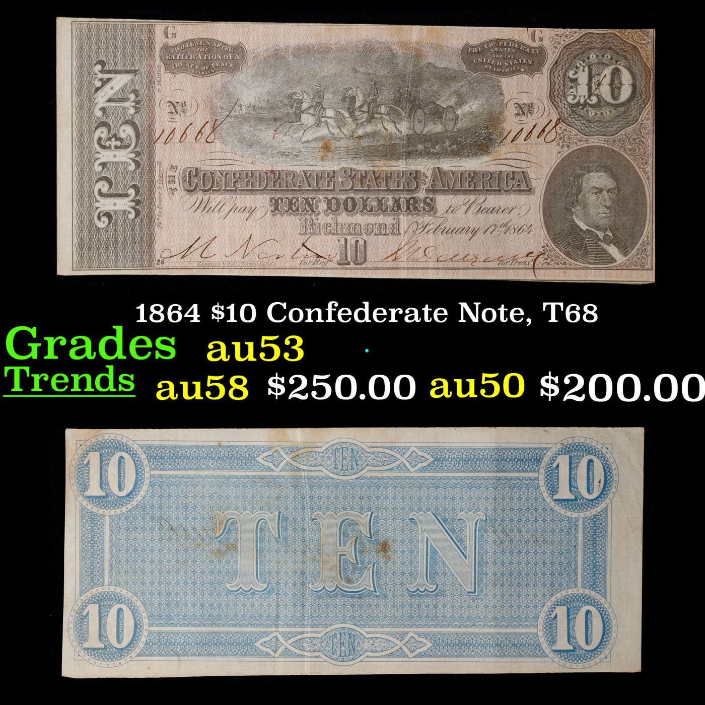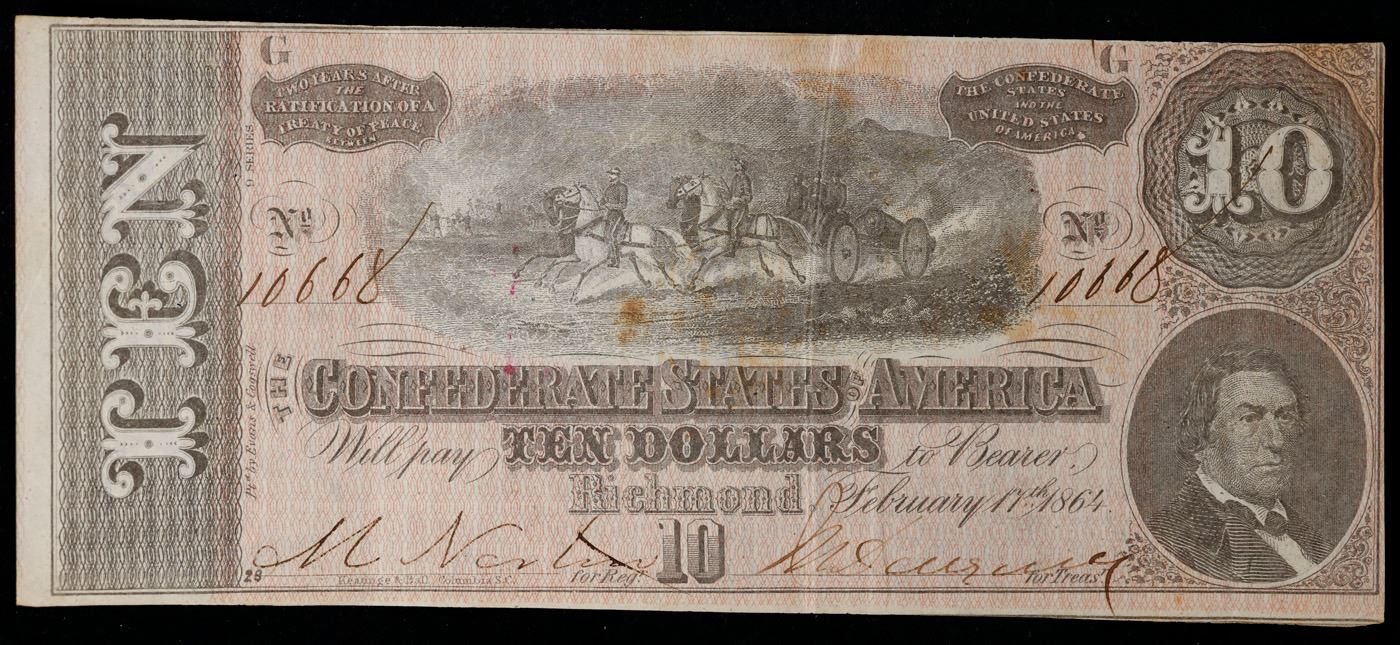 1864 $10 Confederate Note, T68 Grades Select AU. Of great historical interest this is the last $10 currency notes issued by the Confederate States of America. The 7th and last issue of Confederate notes. Notes hand signed and numbered by Confederate soldiers and families. Printed and issued over 140 years ago during the Civil War. Depicts Confederate cabinet member Robert M. T. Hunter and features a detailed vignette of horse-drawn artillery. This large 7" x 3" Confederate $10 note is a genuine keepsake from one of the most significant periods in American history.
