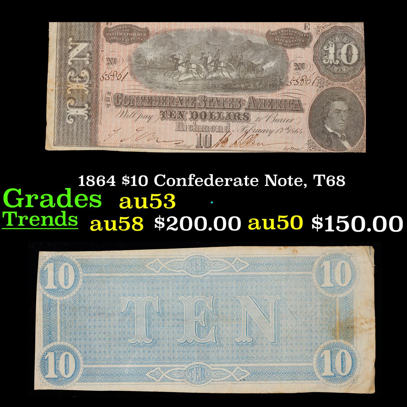 1864 $10 Confederate Note, T68 Grades Select AU. Of great historical interest this is the last $10 currency notes issued by the Confederate States of America. The 7th and last issue of Confederate notes. Notes hand signed and numbered by Confederate soldiers and families. Printed and issued over 140 years ago during the Civil War. Depicts Confederate cabinet member Robert M. T. Hunter and features a detailed vignette of horse-drawn artillery. This large 7" x 3" Confederate $10 note is a genuine keepsake from one of the most significant periods in American history.