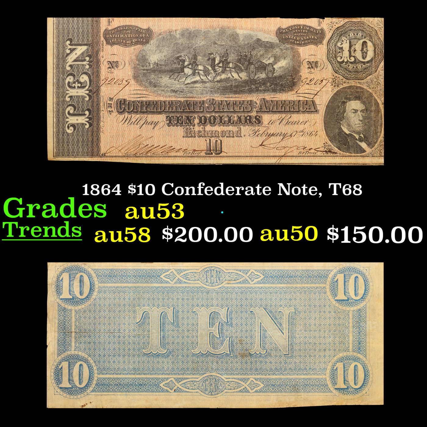 1864 $10 Confederate Note, T68 Grades Select AU. Of great historical interest this is the last $10 currency notes issued by the Confederate States of America. The 7th and last issue of Confederate notes. Notes hand signed and numbered by Confederate soldiers and families. Printed and issued over 140 years ago during the Civil War. Depicts Confederate cabinet member Robert M. T. Hunter and features a detailed vignette of horse-drawn artillery. This large 7" x 3" Confederate $10 note is a genuine keepsake from one of the most significant periods in American history.