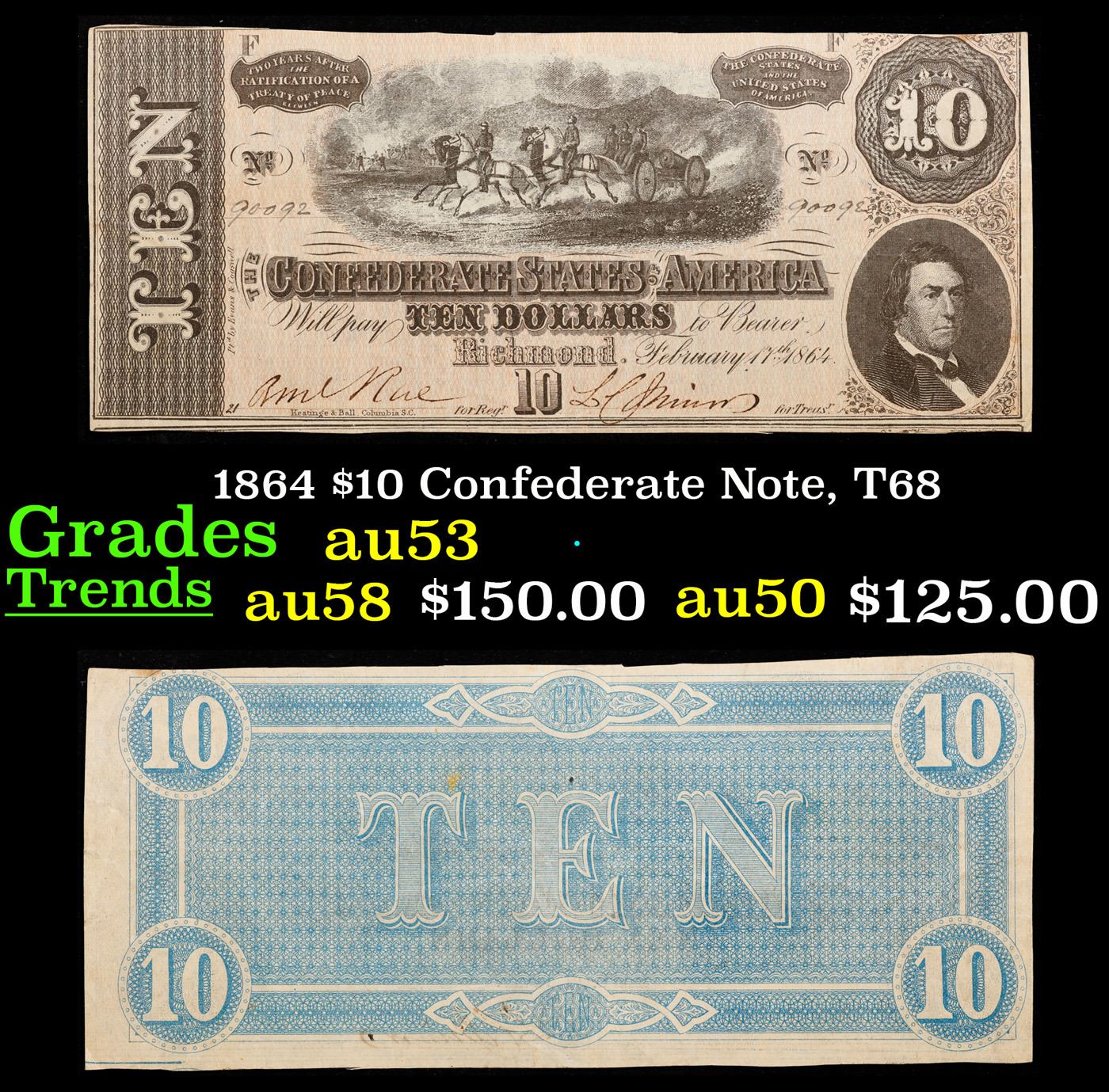 1864 $10 Confederate Note, T68 Grades Select AU. Of great historical interest this is the last $10 currency notes issued by the Confederate States of America. The 7th and last issue of Confederate notes. Notes hand signed and numbered by Confederate soldiers and families. Printed and issued over 140 years ago during the Civil War. Depicts Confederate cabinet member Robert M. T. Hunter and features a detailed vignette of horse-drawn artillery. This large 7" x 3" Confederate $10 note is a genuine keepsake from one of the most significant periods in American history.