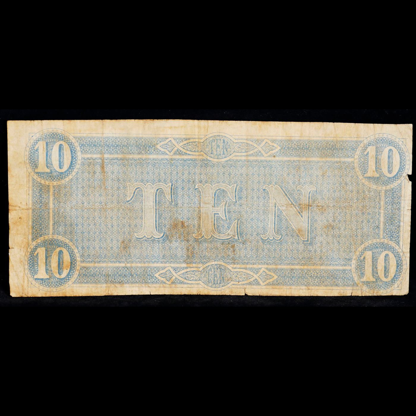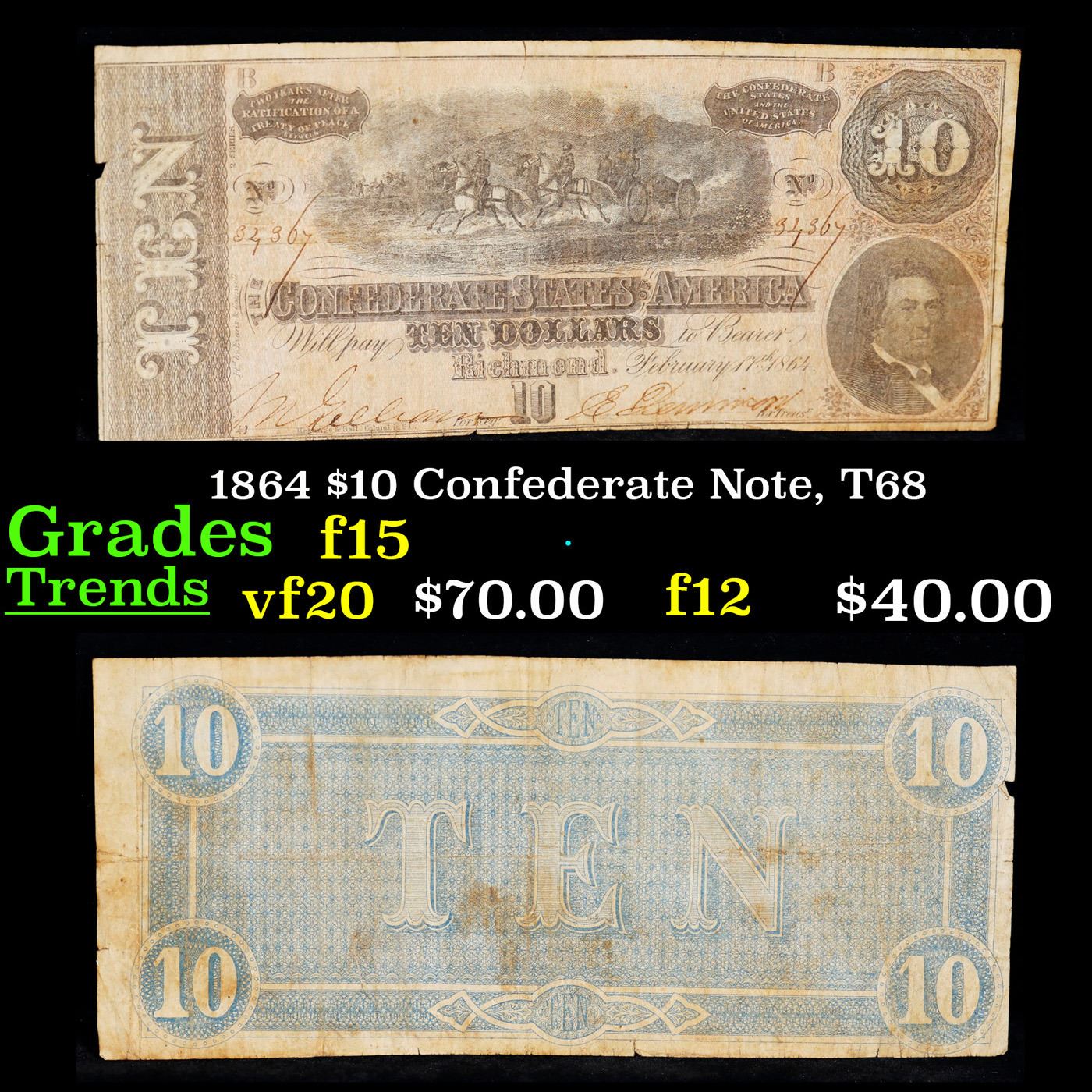 1864 $10 Confederate Note, T68 Grades f+. Of great historical interest this is the last $10 currency notes issued by the Confederate States of America. The 7th and last issue of Confederate notes. Notes hand signed and numbered by Confederate soldiers and families. Printed and issued over 140 years ago during the Civil War. Depicts Confederate cabinet member Robert M. T. Hunter and features a detailed vignette of horse-drawn artillery. This large 7" x 3" Confederate $10 note is a genuine keepsake from one of the most significant periods in American history.