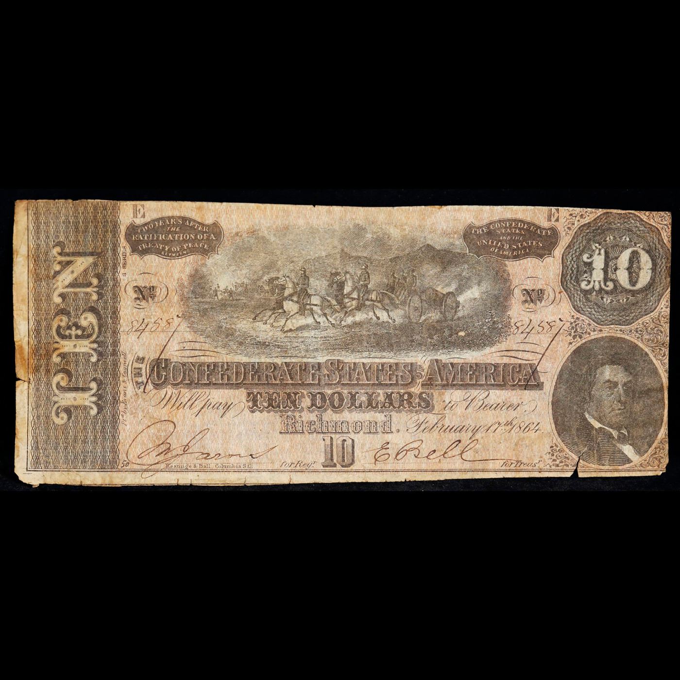 1864 $10 Confederate Note, T68 Grades f+. Of great historical interest this is the last $10 currency notes issued by the Confederate States of America. The 7th and last issue of Confederate notes. Notes hand signed and numbered by Confederate soldiers and families. Printed and issued over 140 years ago during the Civil War. Depicts Confederate cabinet member Robert M. T. Hunter and features a detailed vignette of horse-drawn artillery. This large 7" x 3" Confederate $10 note is a genuine keepsake from one of the most significant periods in American history.