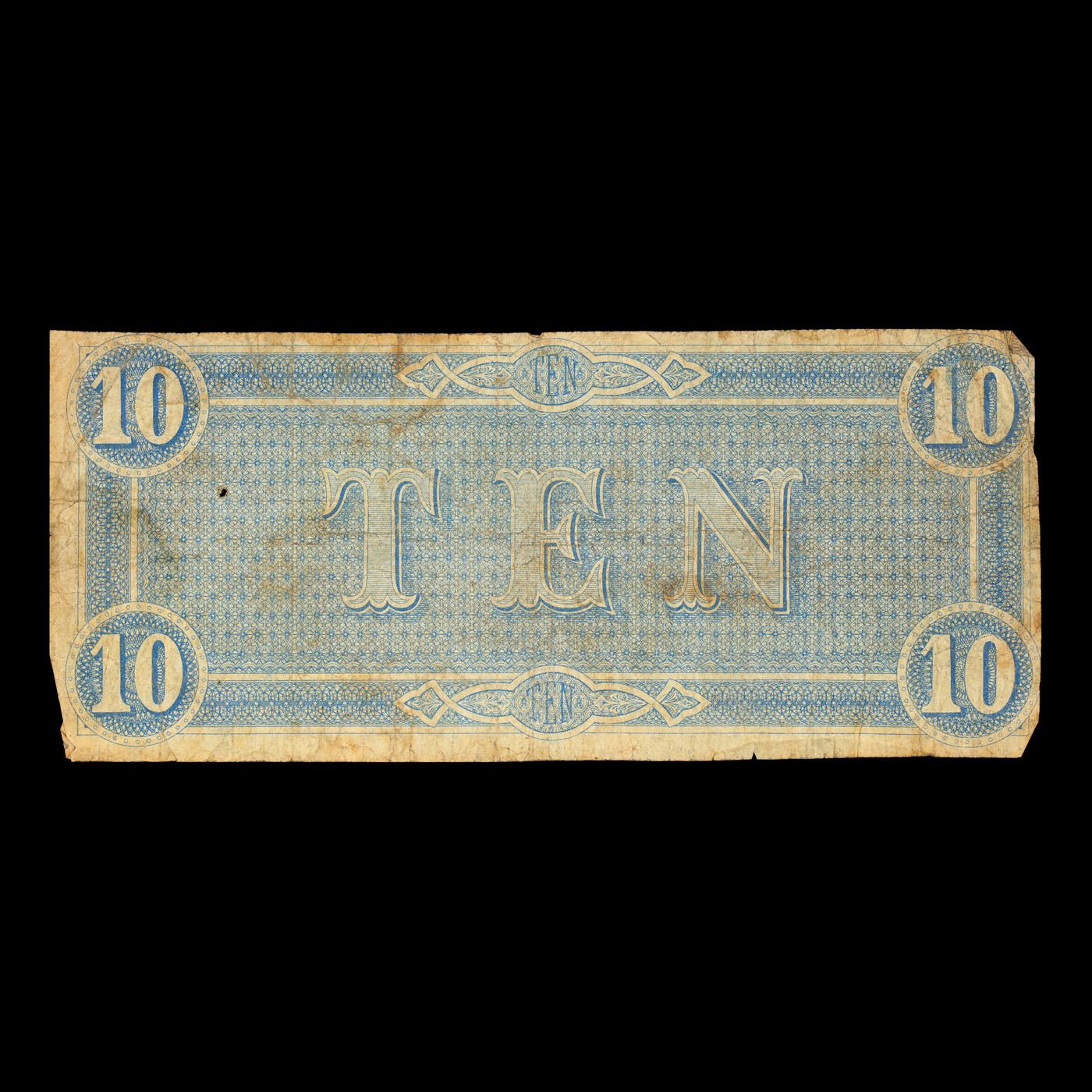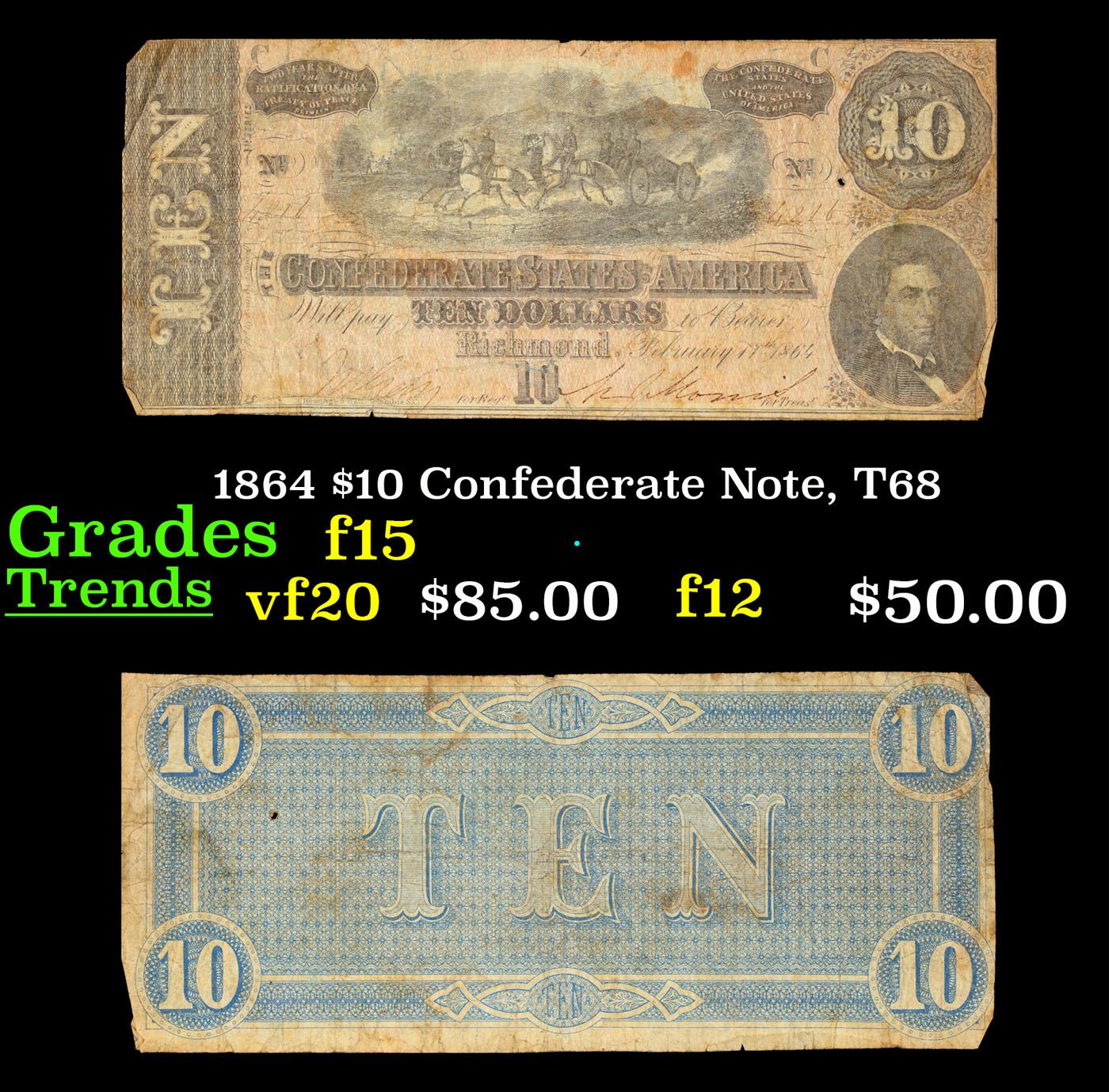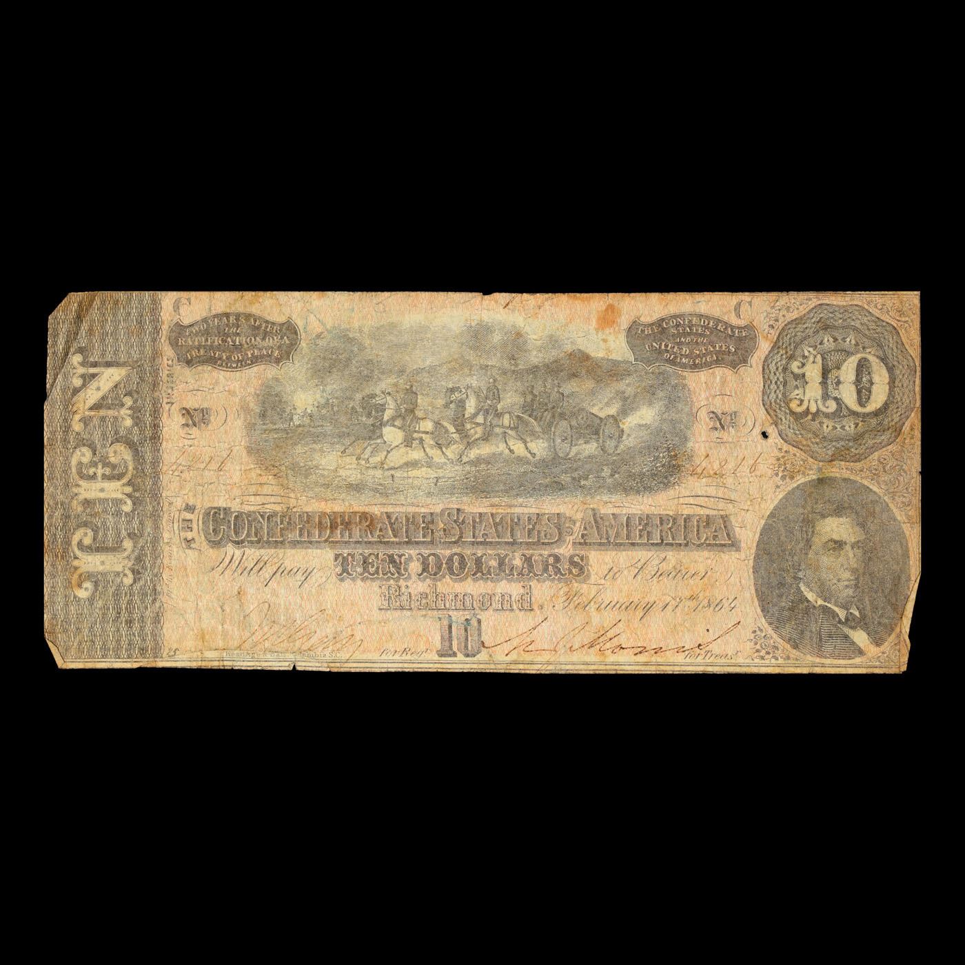 1864 $10 Confederate Note, T68 Grades f+. Of great historical interest this is the last $10 currency notes issued by the Confederate States of America. The 7th and last issue of Confederate notes. Notes hand signed and numbered by Confederate soldiers and families. Printed and issued over 140 years ago during the Civil War. Depicts Confederate cabinet member Robert M. T. Hunter and features a detailed vignette of horse-drawn artillery. This large 7" x 3" Confederate $10 note is a genuine keepsake from one of the most significant periods in American history.