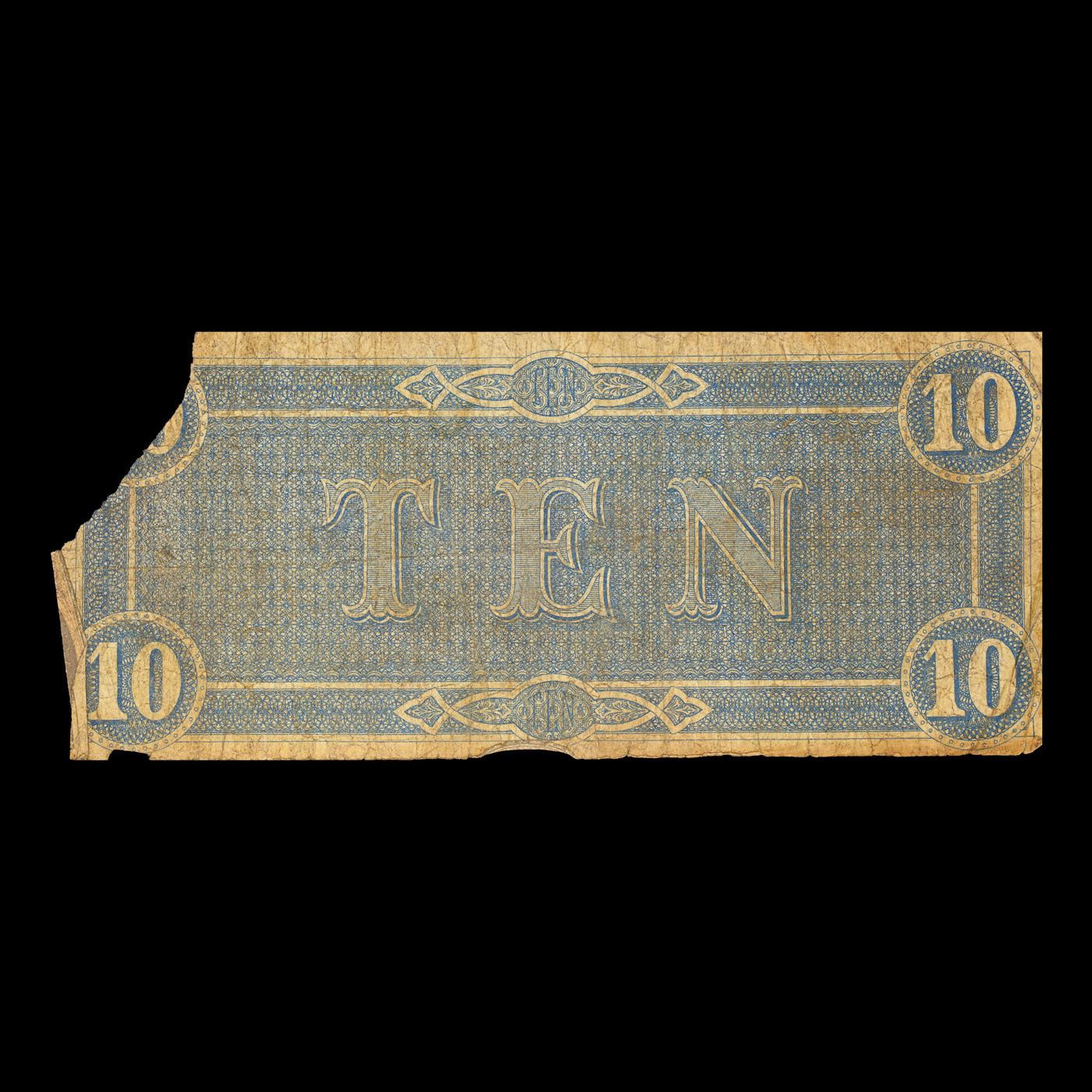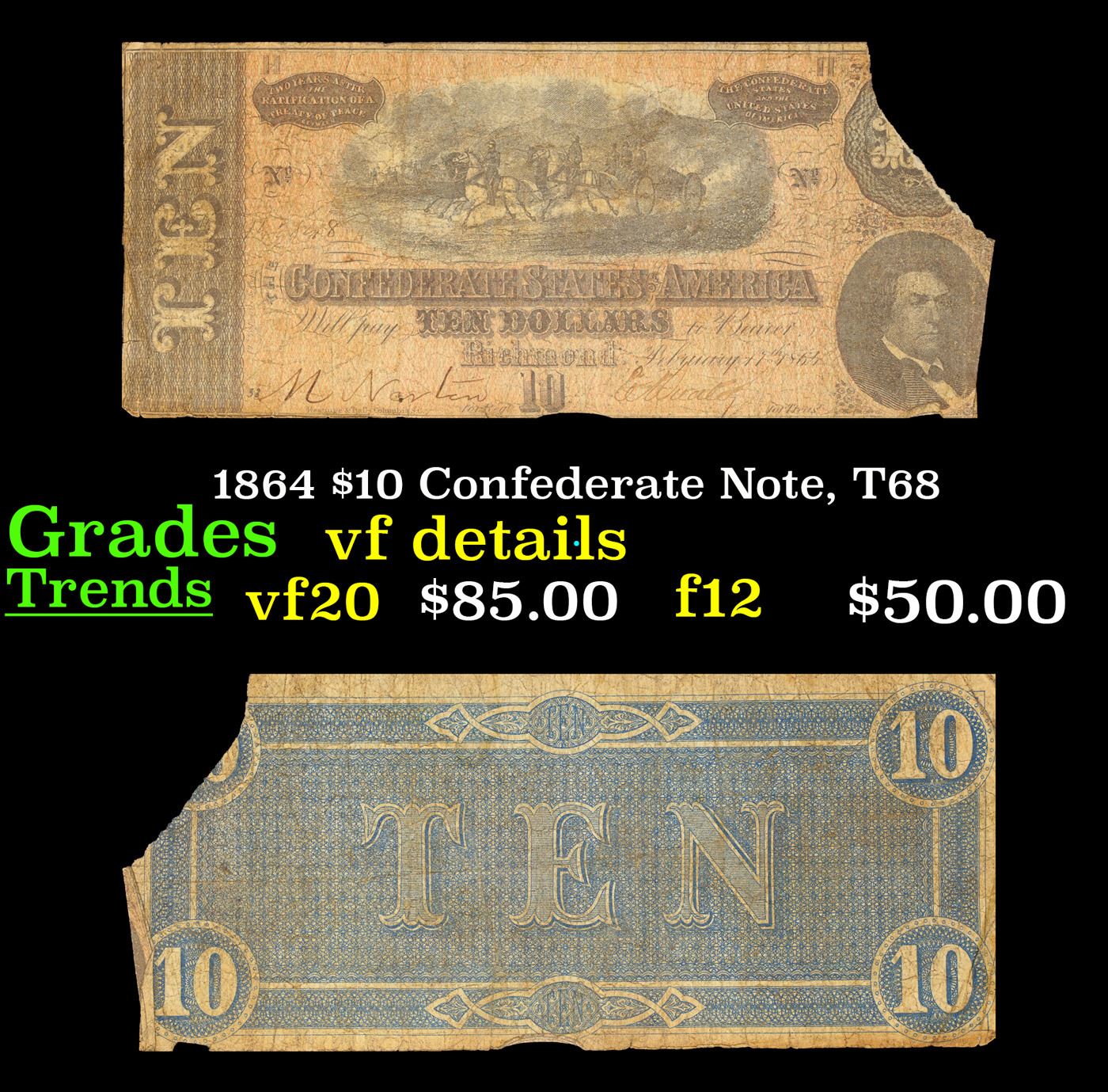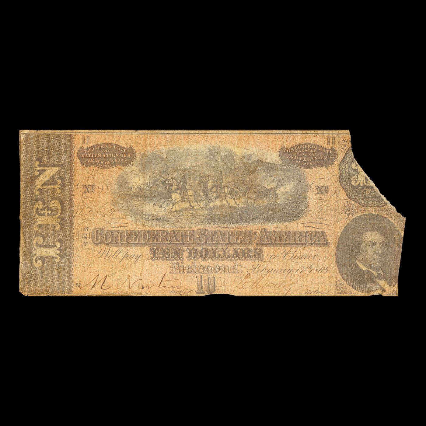 1864 $10 Confederate Note, T68 Grades vf details. Of great historical interest this is the last $10 currency notes issued by the Confederate States of America. The 7th and last issue of Confederate notes. Notes hand signed and numbered by Confederate soldiers and families. Printed and issued over 140 years ago during the Civil War. Depicts Confederate cabinet member Robert M. T. Hunter and features a detailed vignette of horse-drawn artillery. This large 7" x 3" Confederate $10 note is a genuine keepsake from one of the most significant periods in American history.