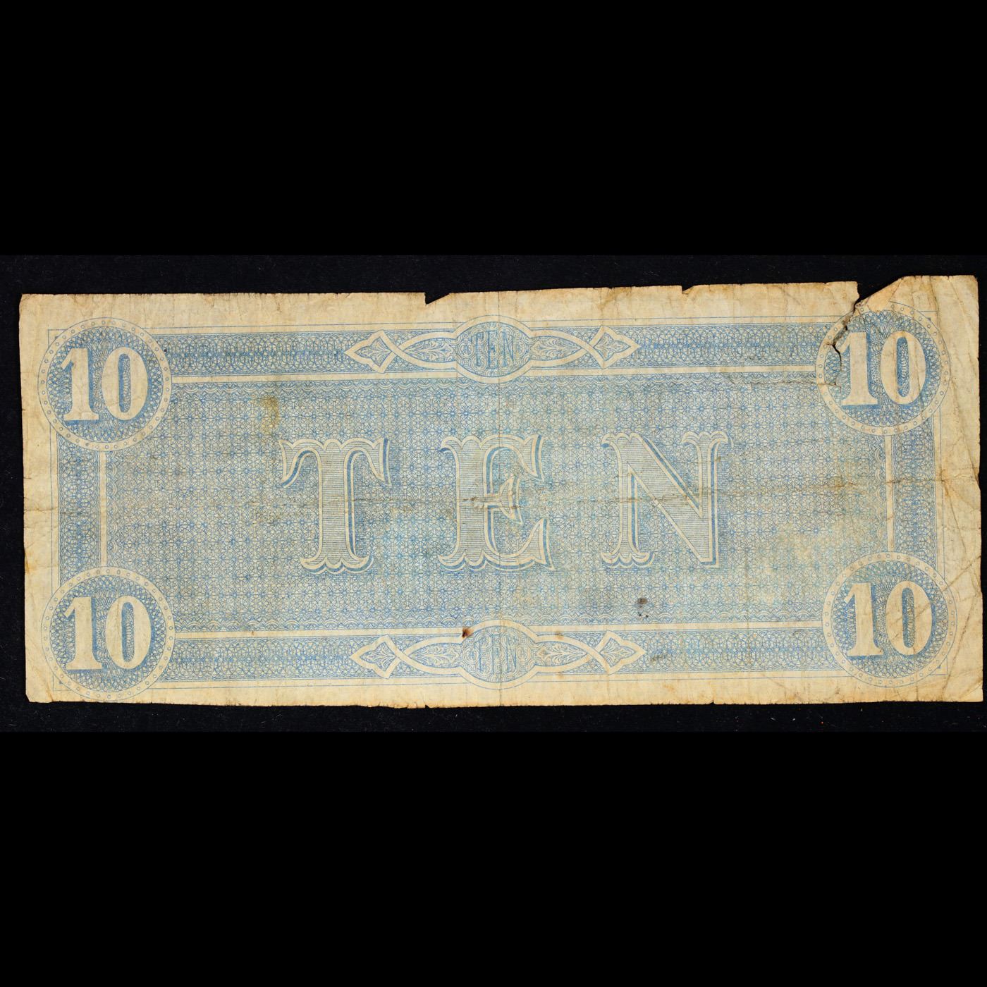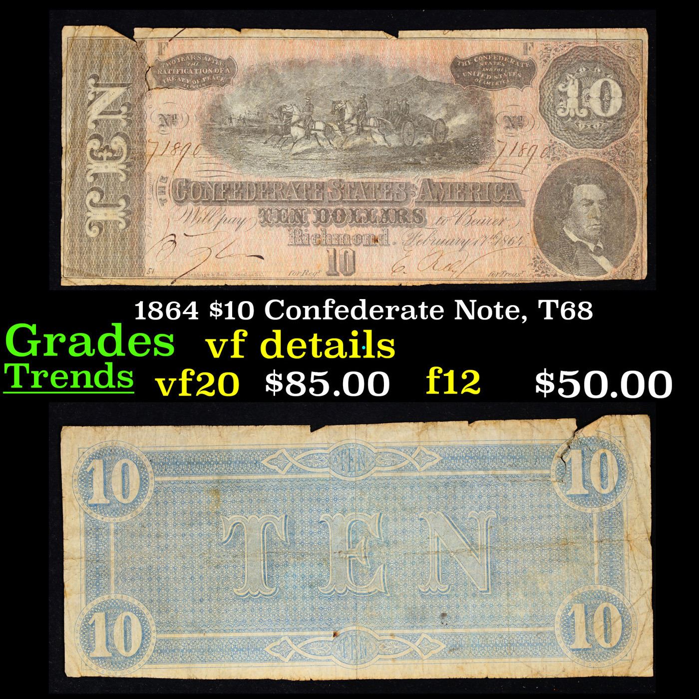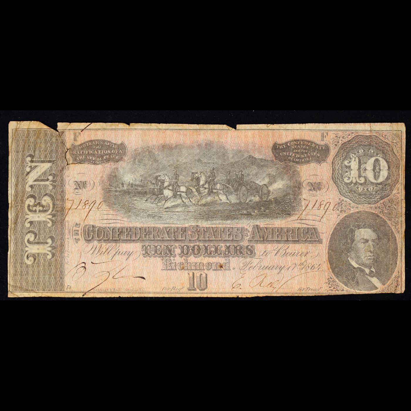1864 $10 Confederate Note, T68 Grades vf details. Of great historical interest this is the last $10 currency notes issued by the Confederate States of America. The 7th and last issue of Confederate notes. Notes hand signed and numbered by Confederate soldiers and families. Printed and issued over 140 years ago during the Civil War. Depicts Confederate cabinet member Robert M. T. Hunter and features a detailed vignette of horse-drawn artillery. This large 7" x 3" Confederate $10 note is a genuine keepsake from one of the most significant periods in American history.