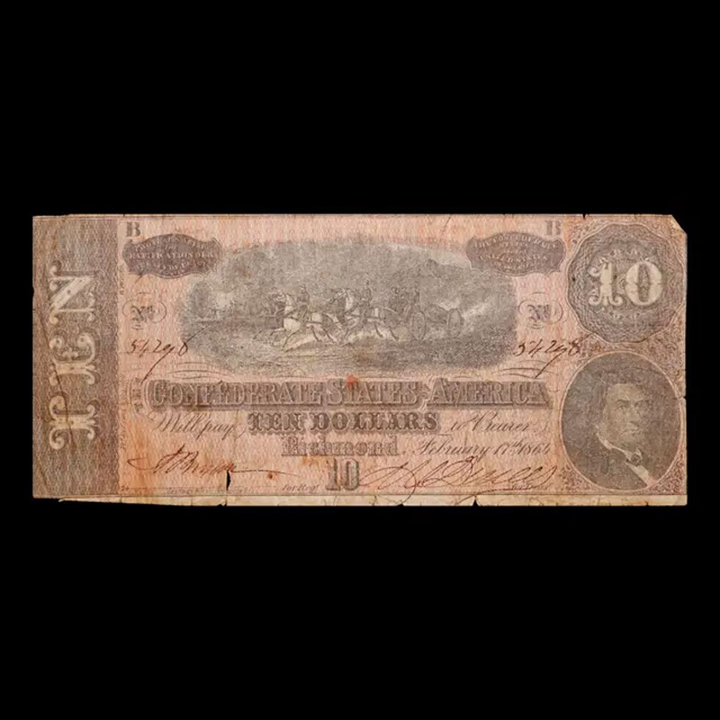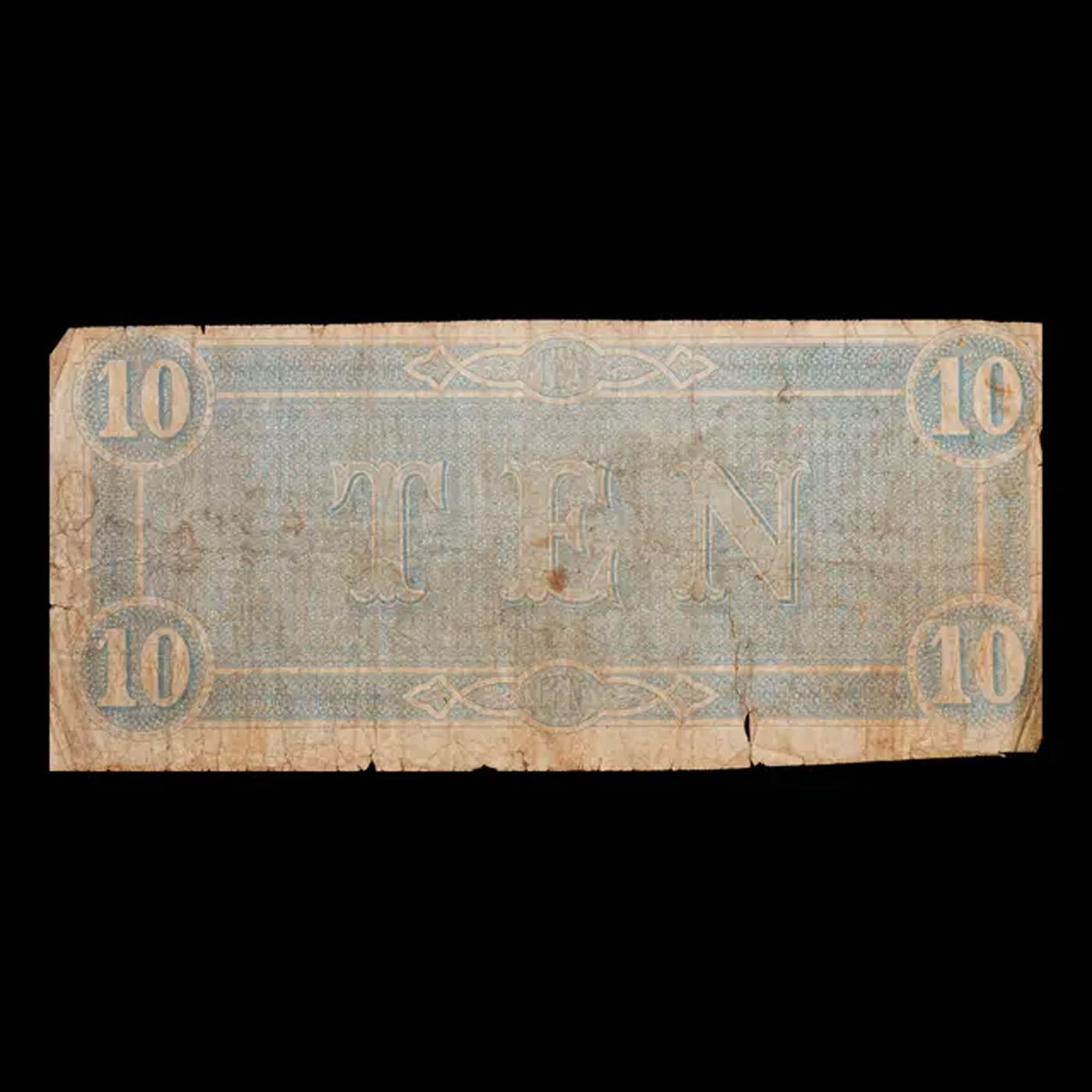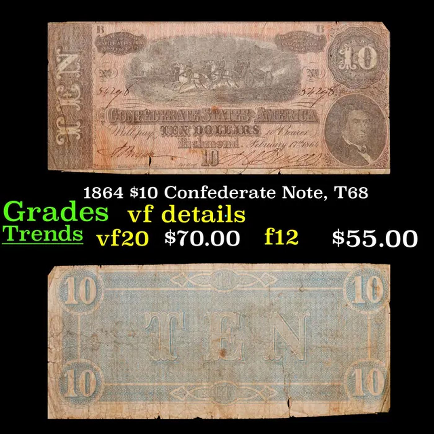 1864 $10 Confederate Note, T68 Grades vf details. Of great historical interest this is the last $10 currency notes issued by the Confederate States of America. The 7th and last issue of Confederate notes. Notes hand signed and numbered by Confederate soldiers and families. Printed and issued over 140 years ago during the Civil War. Depicts Confederate cabinet member Robert M. T. Hunter and features a detailed vignette of horse-drawn artillery. This large 7" x 3" Confederate $10 note is a genuine keepsake from one of the most significant periods in American history.