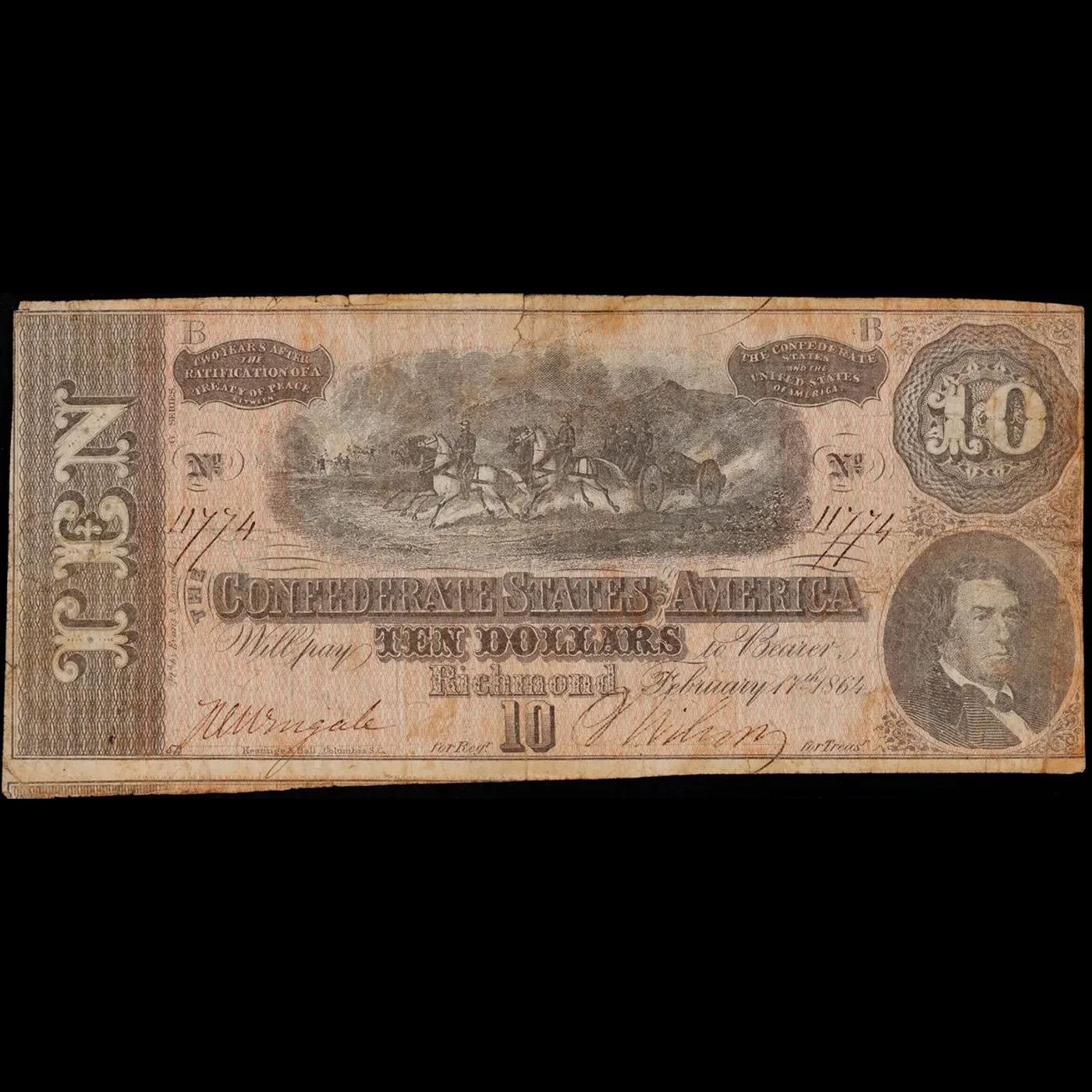 1864 $10 Confederate Note, T68 Grades vf details. Of great historical interest this is the last $10 currency notes issued by the Confederate States of America. The 7th and last issue of Confederate notes. Notes hand signed and numbered by Confederate soldiers and families. Printed and issued over 140 years ago during the Civil War. Depicts Confederate cabinet member Robert M. T. Hunter and features a detailed vignette of horse-drawn artillery. This large 7" x 3" Confederate $10 note is a genuine keepsake from one of the most significant periods in American history.