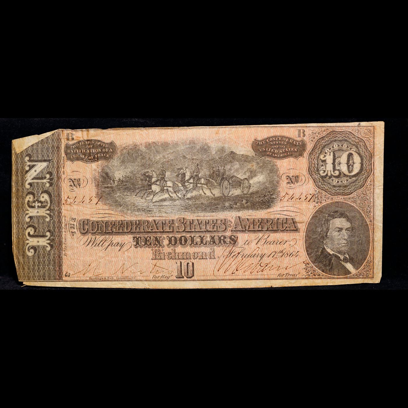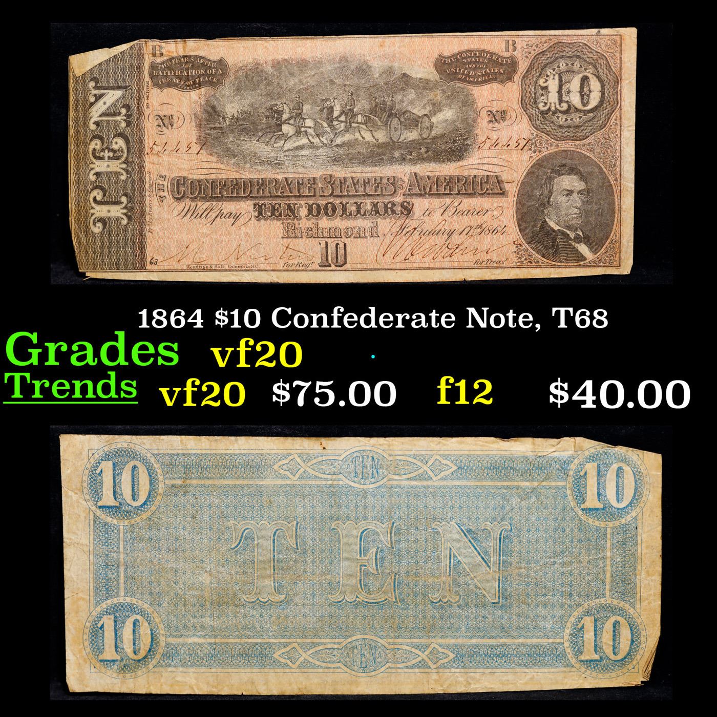1864 $10 Confederate Note, T68 Grades vf, very fine. Of great historical interest this is the last $10 currency notes issued by the Confederate States of America. The 7th and last issue of Confederate notes. Notes hand signed and numbered by Confederate soldiers and families. Printed and issued over 140 years ago during the Civil War. Depicts Confederate cabinet member Robert M. T. Hunter and features a detailed vignette of horse-drawn artillery. This large 7" x 3" Confederate $10 note is a genuine keepsake from one of the most significant periods in American history.