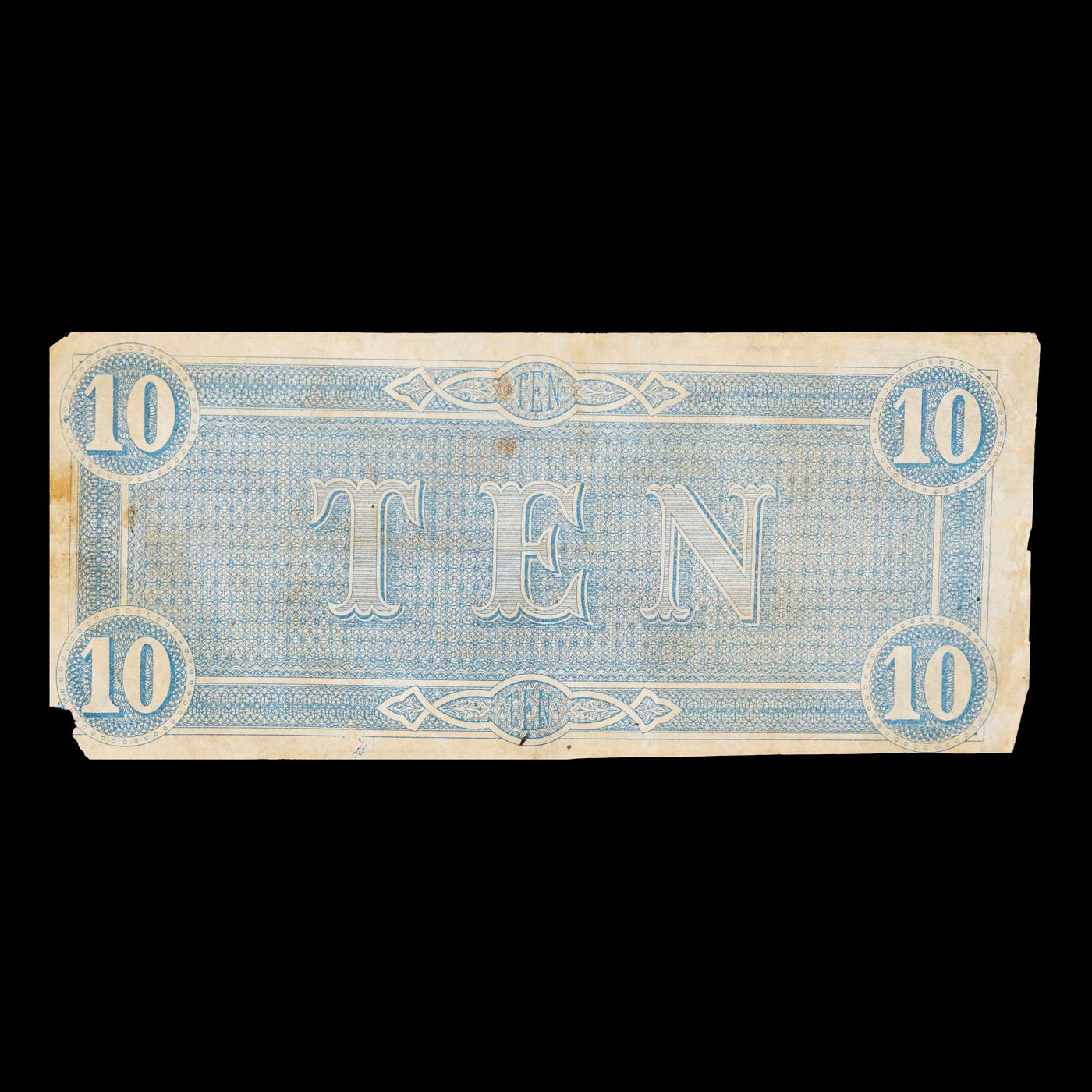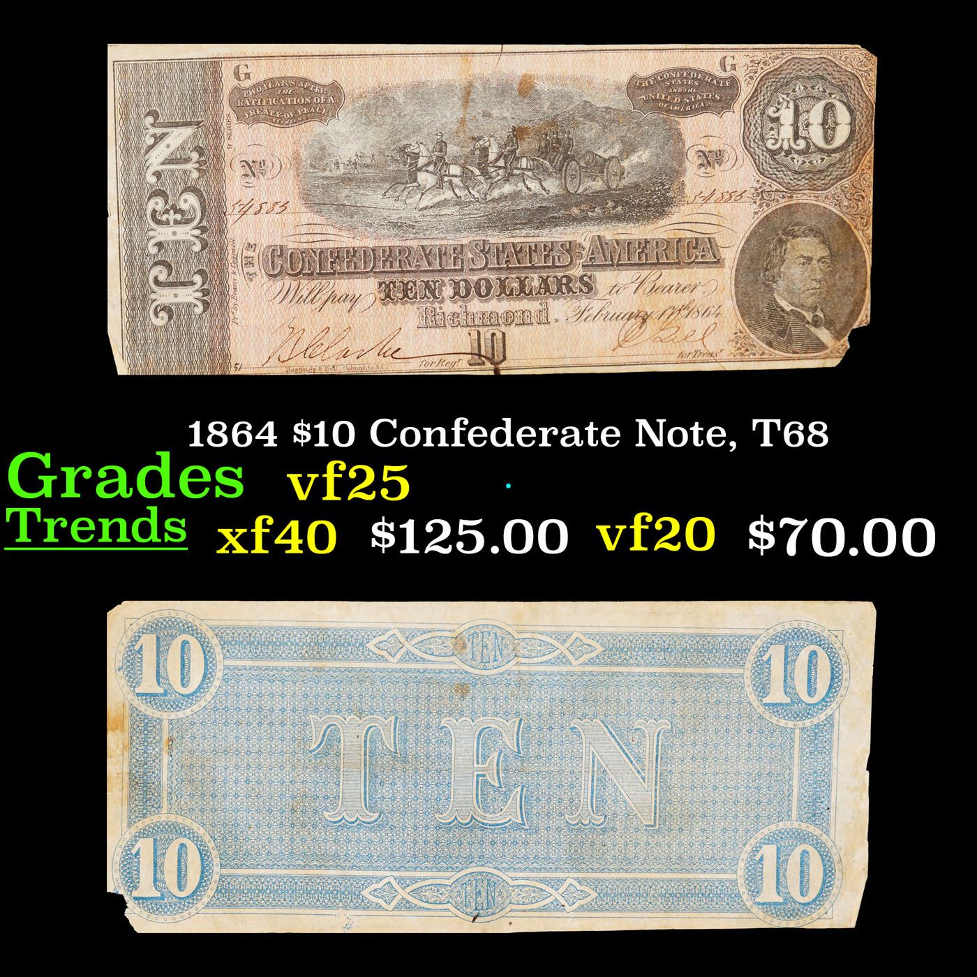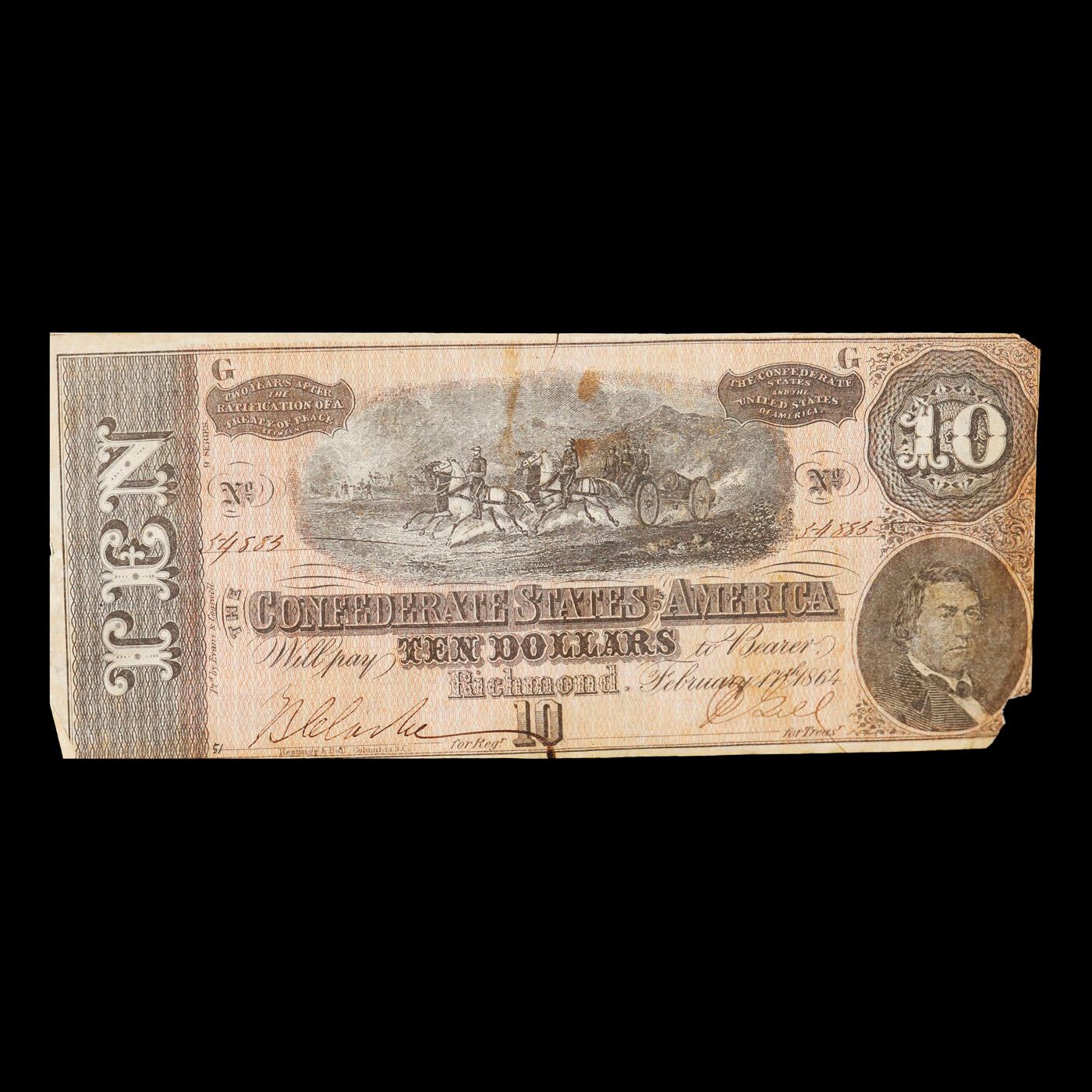 1864 $10 Confederate Note, T68 Grades vf+. Of great historical interest this is the last $10 currency notes issued by the Confederate States of America. The 7th and last issue of Confederate notes. Notes hand signed and numbered by Confederate soldiers and families. Printed and issued over 140 years ago during the Civil War. Depicts Confederate cabinet member Robert M. T. Hunter and features a detailed vignette of horse-drawn artillery. This large 7" x 3" Confederate $10 note is a genuine keepsake from one of the most significant periods in American history.