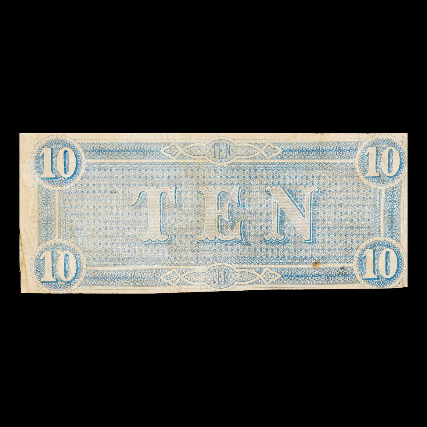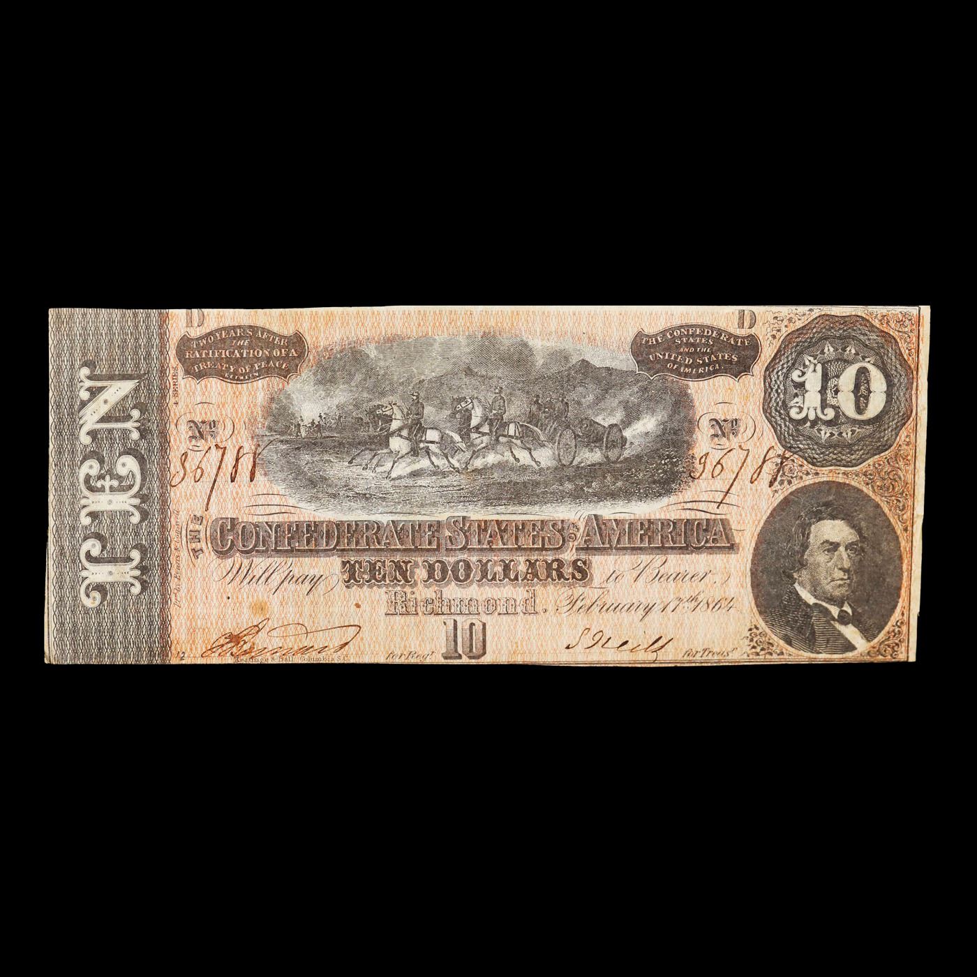 1864 $10 Confederate Note, T68 Grades vf+. Of great historical interest this is the last $10 currency notes issued by the Confederate States of America. The 7th and last issue of Confederate notes. Notes hand signed and numbered by Confederate soldiers and families. Printed and issued over 140 years ago during the Civil War. Depicts Confederate cabinet member Robert M. T. Hunter and features a detailed vignette of horse-drawn artillery. This large 7" x 3" Confederate $10 note is a genuine keepsake from one of the most significant periods in American history.