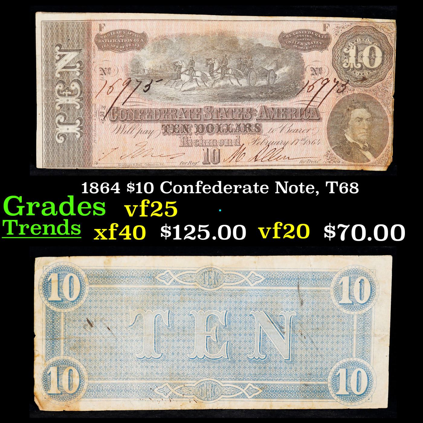 1864 $10 Confederate Note, T68 Grades vf+. Of great historical interest this is the last $10 currency notes issued by the Confederate States of America. The 7th and last issue of Confederate notes. Notes hand signed and numbered by Confederate soldiers and families. Printed and issued over 140 years ago during the Civil War. Depicts Confederate cabinet member Robert M. T. Hunter and features a detailed vignette of horse-drawn artillery. This large 7" x 3" Confederate $10 note is a genuine keepsake from one of the most significant periods in American history.