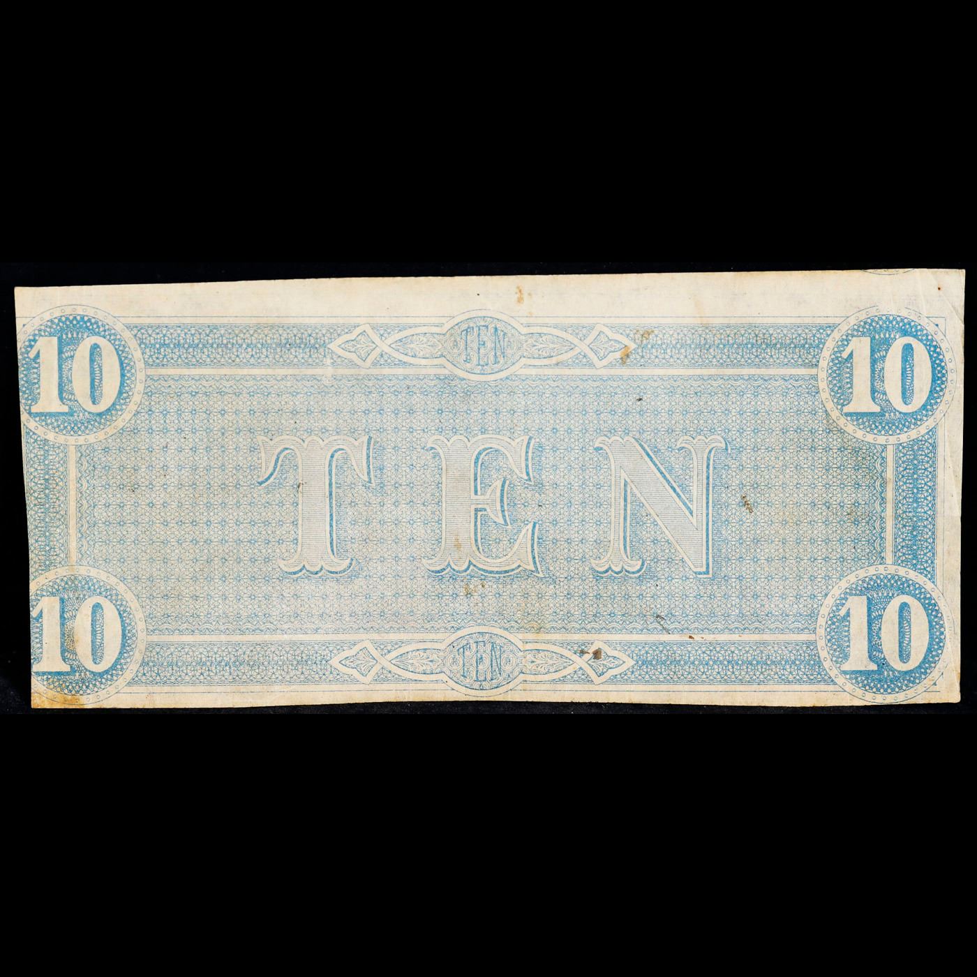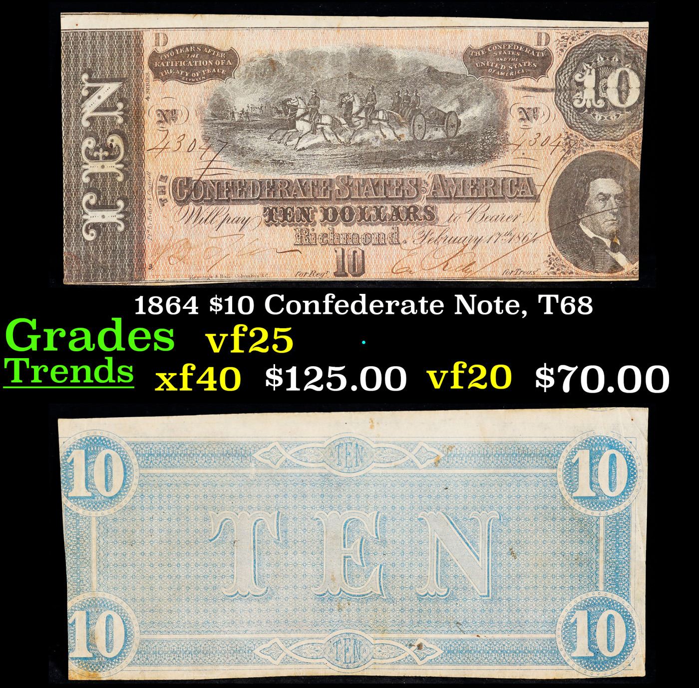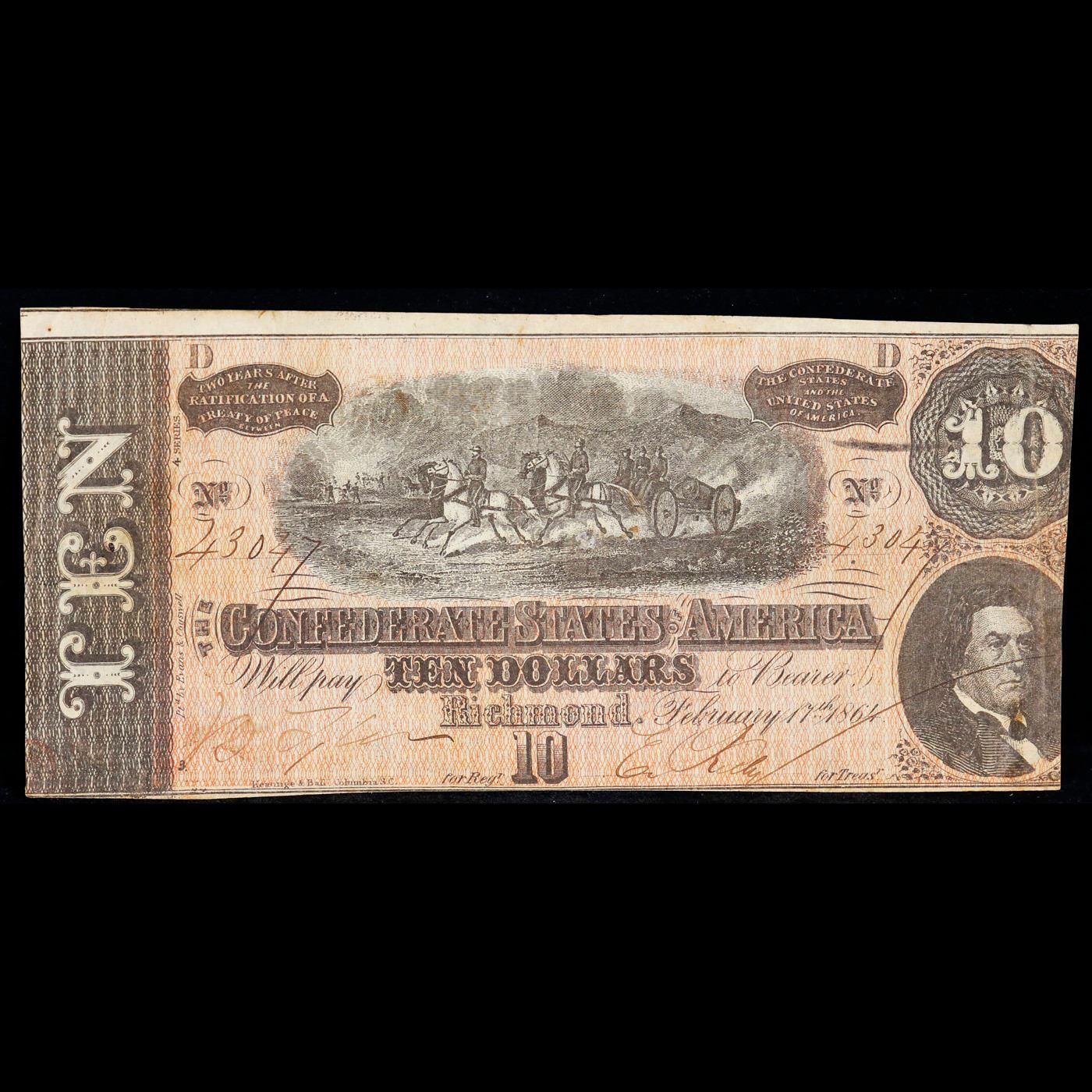 1864 $10 Confederate Note, T68 Grades vf+. Of great historical interest this is the last $10 currency notes issued by the Confederate States of America. The 7th and last issue of Confederate notes. Notes hand signed and numbered by Confederate soldiers and families. Printed and issued over 140 years ago during the Civil War. Depicts Confederate cabinet member Robert M. T. Hunter and features a detailed vignette of horse-drawn artillery. This large 7" x 3" Confederate $10 note is a genuine keepsake from one of the most significant periods in American history.