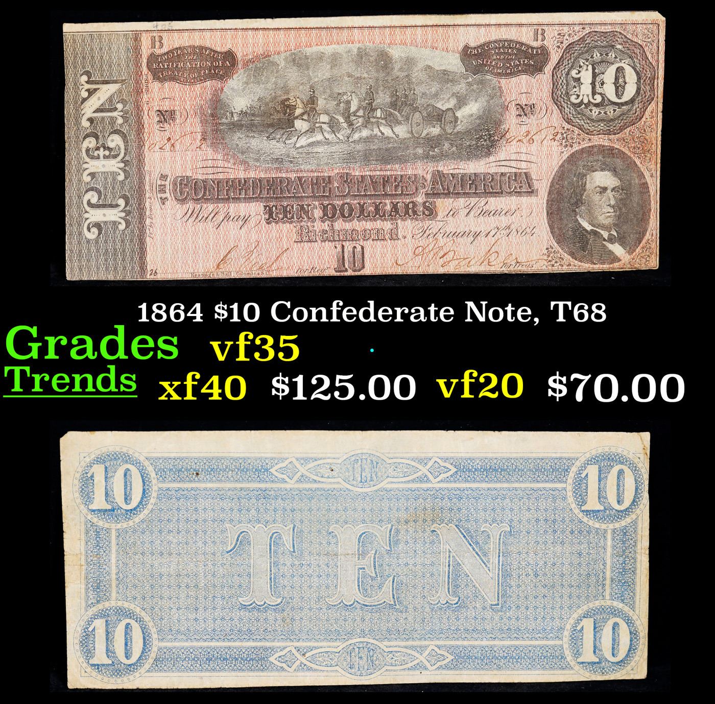 1864 $10 Confederate Note, T68 Grades vf++. Of great historical interest this is the last $10 currency notes issued by the Confederate States of America. The 7th and last issue of Confederate notes. Notes hand signed and numbered by Confederate soldiers and families. Printed and issued over 140 years ago during the Civil War. Depicts Confederate cabinet member Robert M. T. Hunter and features a detailed vignette of horse-drawn artillery. This large 7" x 3" Confederate $10 note is a genuine keepsake from one of the most significant periods in American history.