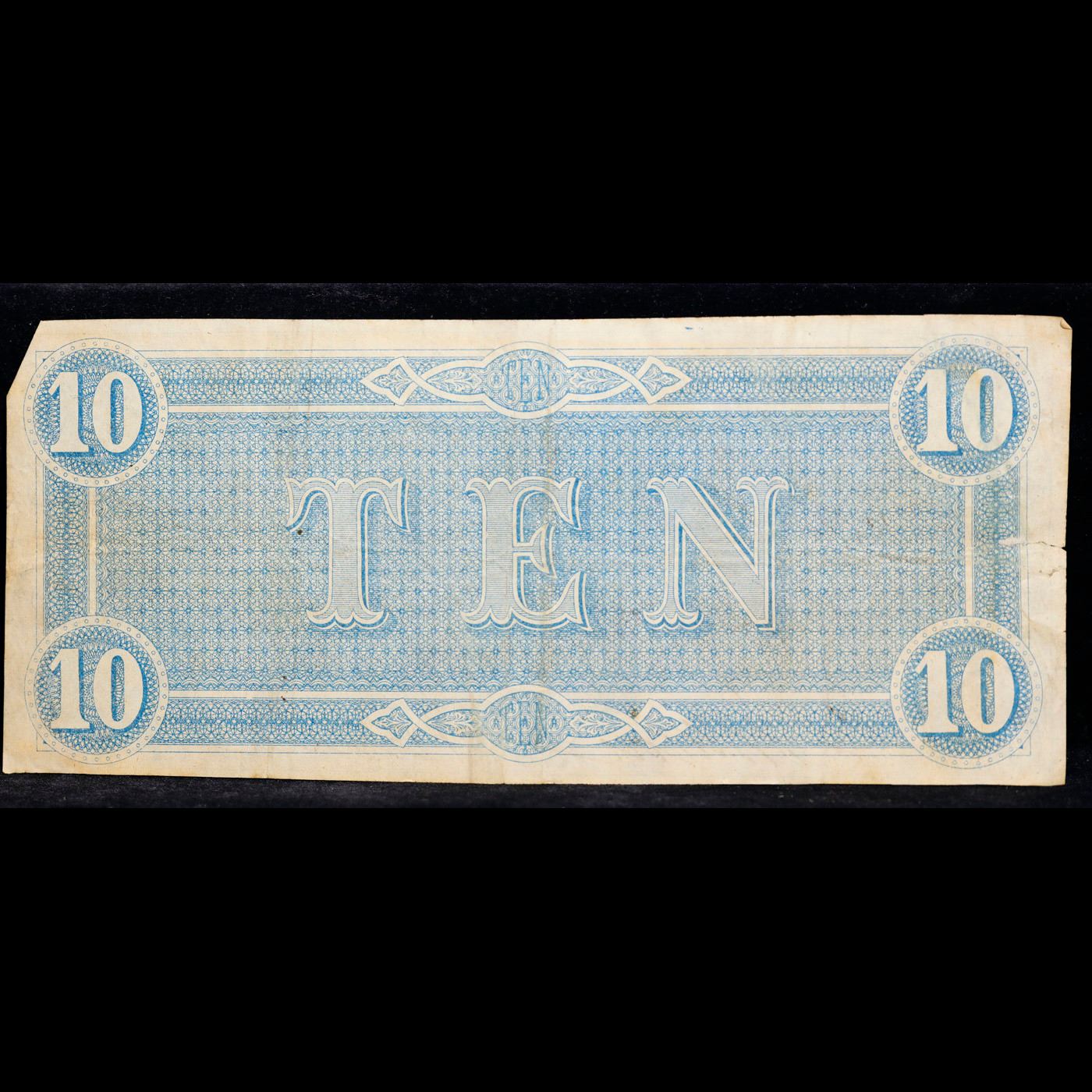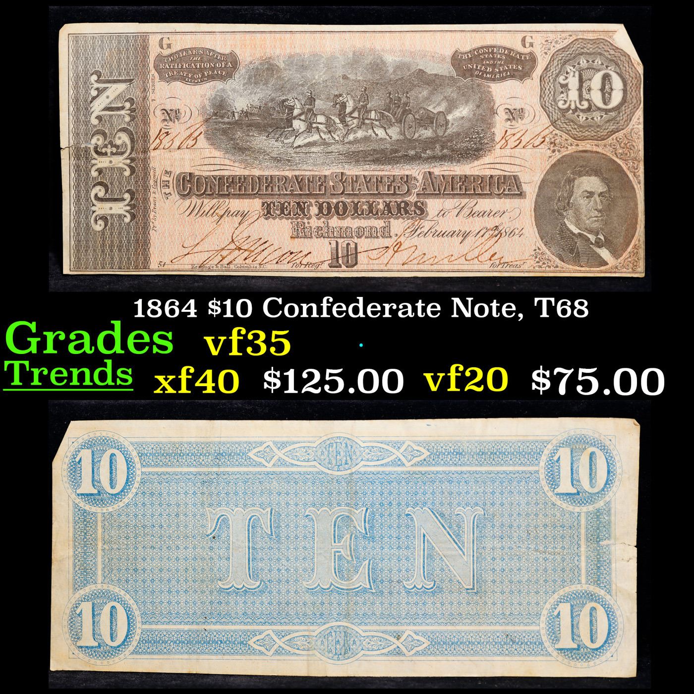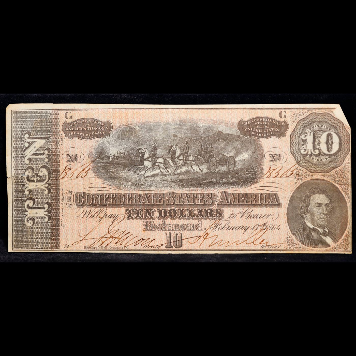 1864 $10 Confederate Note, T68 Grades vf++. Of great historical interest this is the last $10 currency notes issued by the Confederate States of America. The 7th and last issue of Confederate notes. Notes hand signed and numbered by Confederate soldiers and families. Printed and issued over 140 years ago during the Civil War. Depicts Confederate cabinet member Robert M. T. Hunter and features a detailed vignette of horse-drawn artillery. This large 7" x 3" Confederate $10 note is a genuine keepsake from one of the most significant periods in American history.