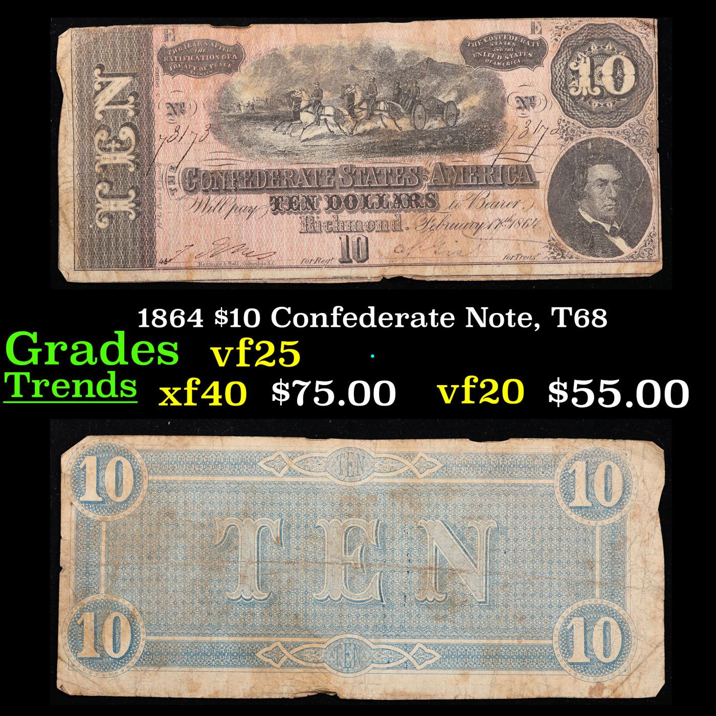 1864 $10 Confederate Note, T68 Grades vf+